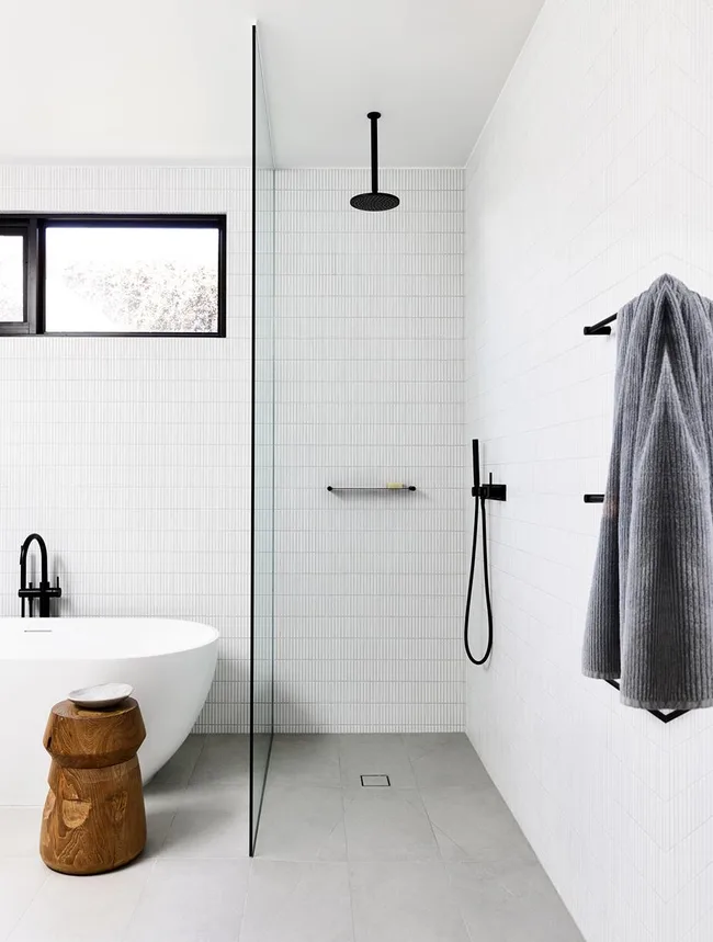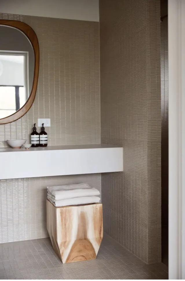 Inax ‘YB1’ tiles from Artedomus add intricate detail and texture to this otherwise monochrome bathroom in a Mornington Peninsula coastal property with an earthy palette.