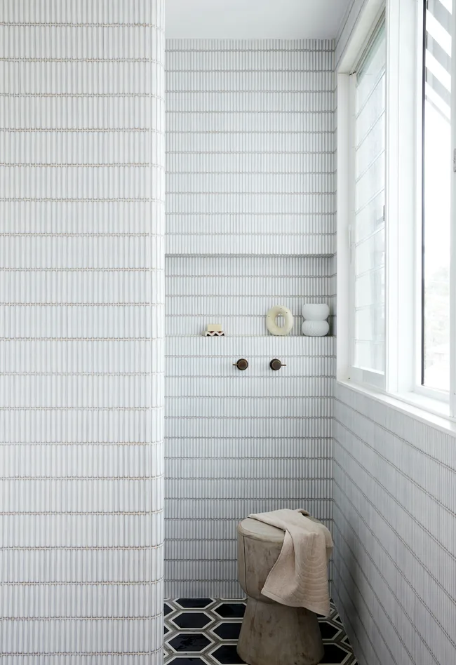The kit kat bathroom wall tiles in this coastal home on Sydney’s Northern Beaches were inspired by the design of a local public bathroom, after the owner first spotted these floor tiles on Instagram.