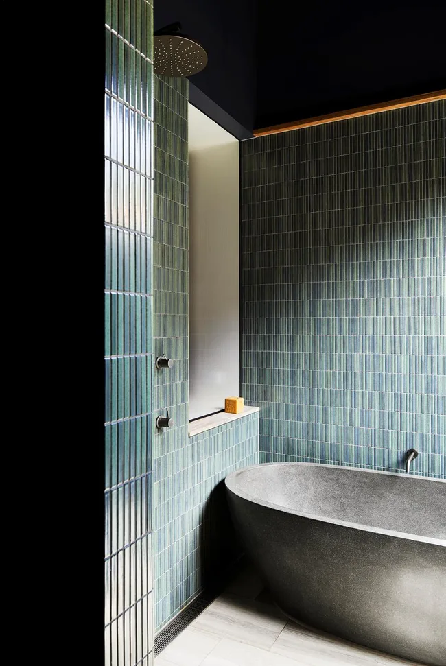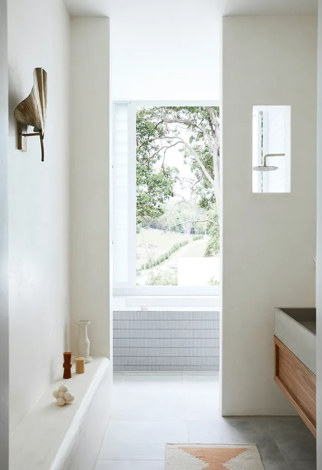 An inset bath becomes a feature in this Byron Bay bathroom that’s dressed head-to-toe in finger tiles.