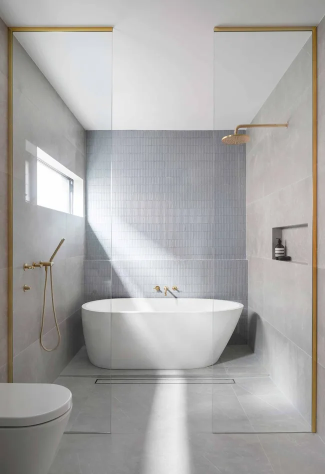 Brushed-brass fittings and subtle finger tiles are a luxurious highlight in the relaxed bathroom in Bec and George’s renovated family home. Their soft grey palette forms the perfect neutral backdrop to the freestanding bath.