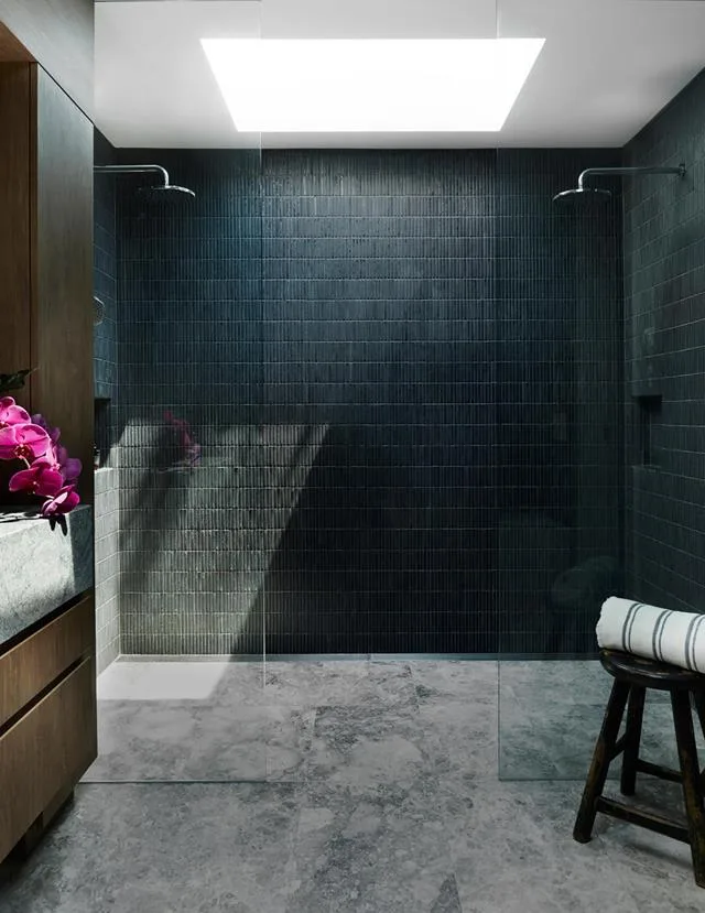Finger tiles in a deep blue tone create a striking feature wall in the double walk-in shower of this contemporary bathroom. A well positioned skylight allows light to flood the space while timber joinery provides additional warmth.
