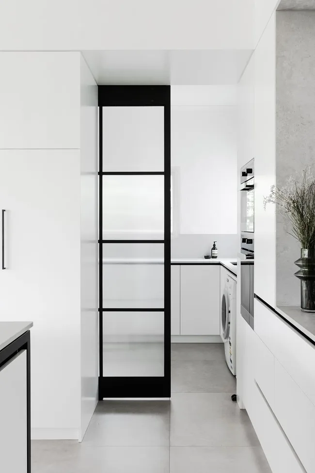 Additional bench space in the laundry comes in handy when the family entertain in this modern-minimal kitchen renovation, while a custom sliding door by Envisage Steel Creations can be pulled shut to close off the room when not in use.