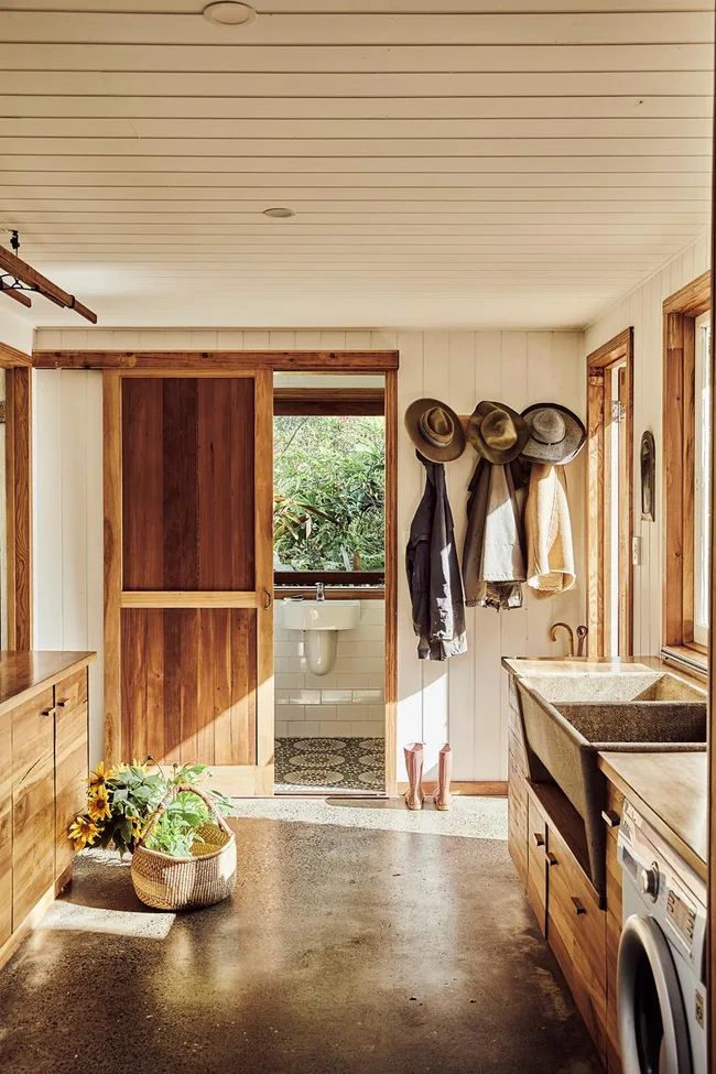 A reclaimed concrete trough features in the timber-filled, farmhouse-style laundry of this multi-generational family home built from sustainable and recycled timbers in the hinterland of Balina.