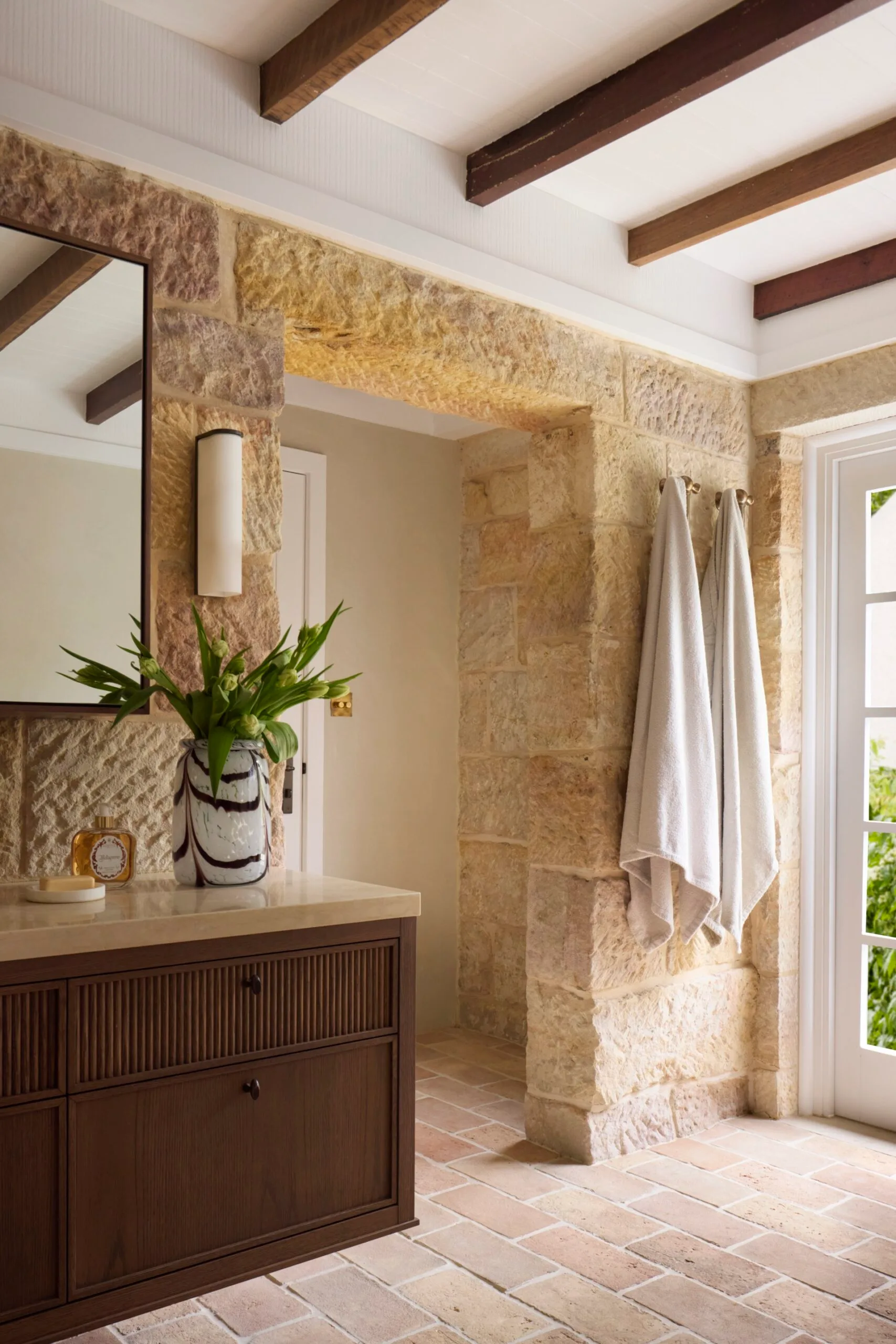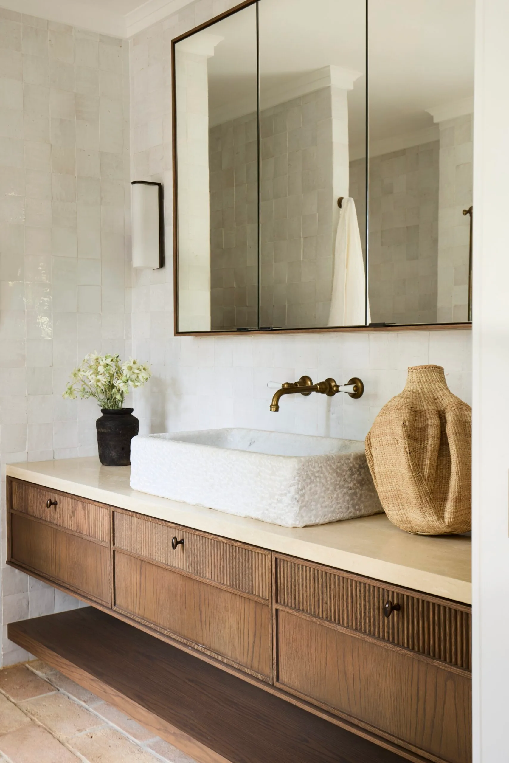 Walls in zellige tiles, Earp Bros. Vanity in custom stained oak, Destro Renovations. Benchtop in travertine, CDK Stone. Sconce, Artìcolo Studios. Tapware, Astra Walker. (Photography: Prue Ruscoe | Styling: Olga Lewis)