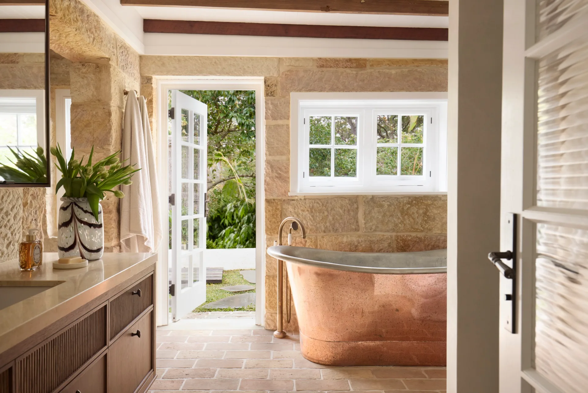 Four bedrooms, an ensuite, laundry and storeroom complete the floorplan – but the standout is the generous family bathroom. Once a compact ensuite, it now offers all the ambience of a wellness retreat at home. Sandstone, travertine and terracotta add layers of warmth and texture, with a copper bath a star feature.