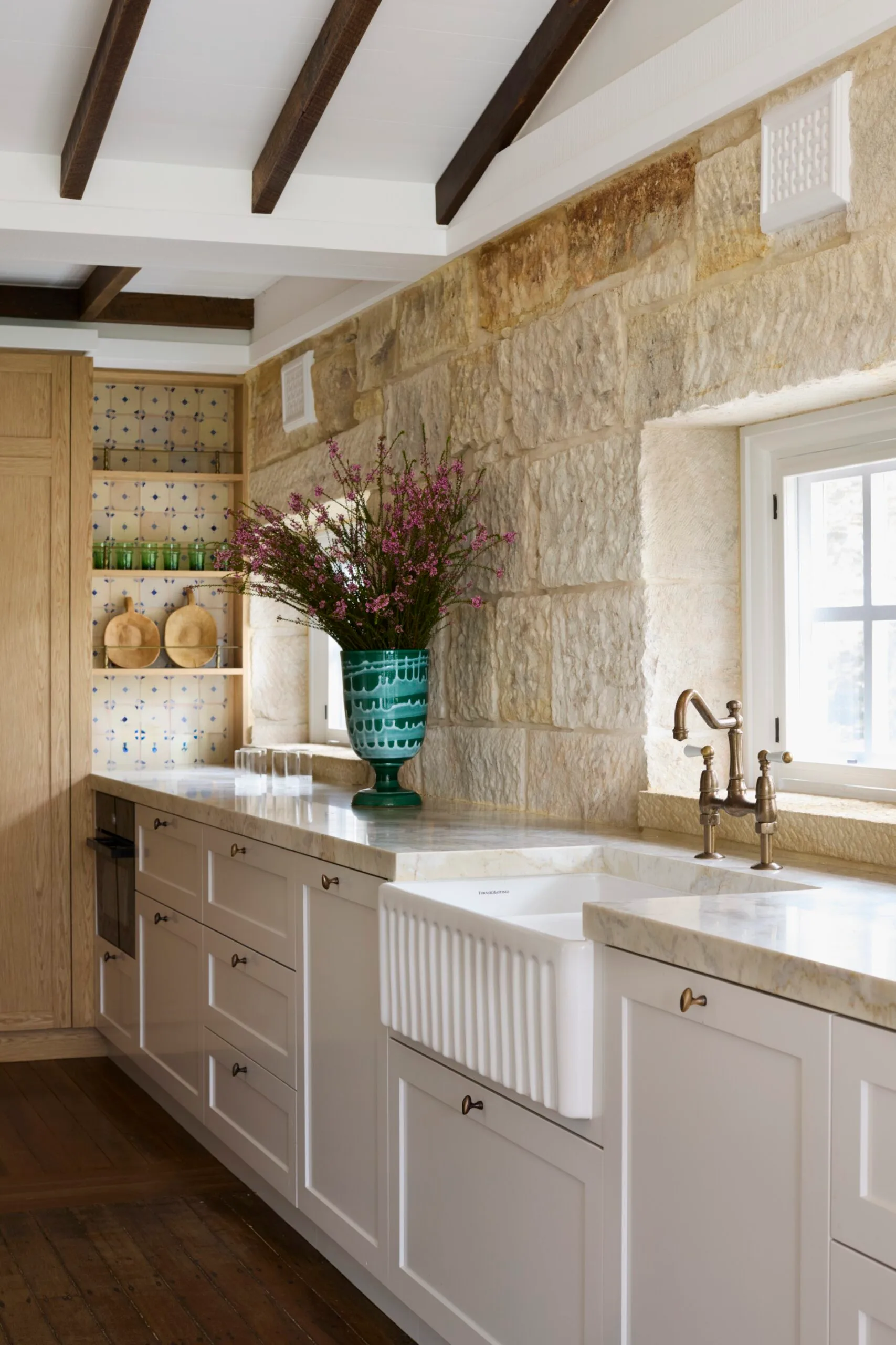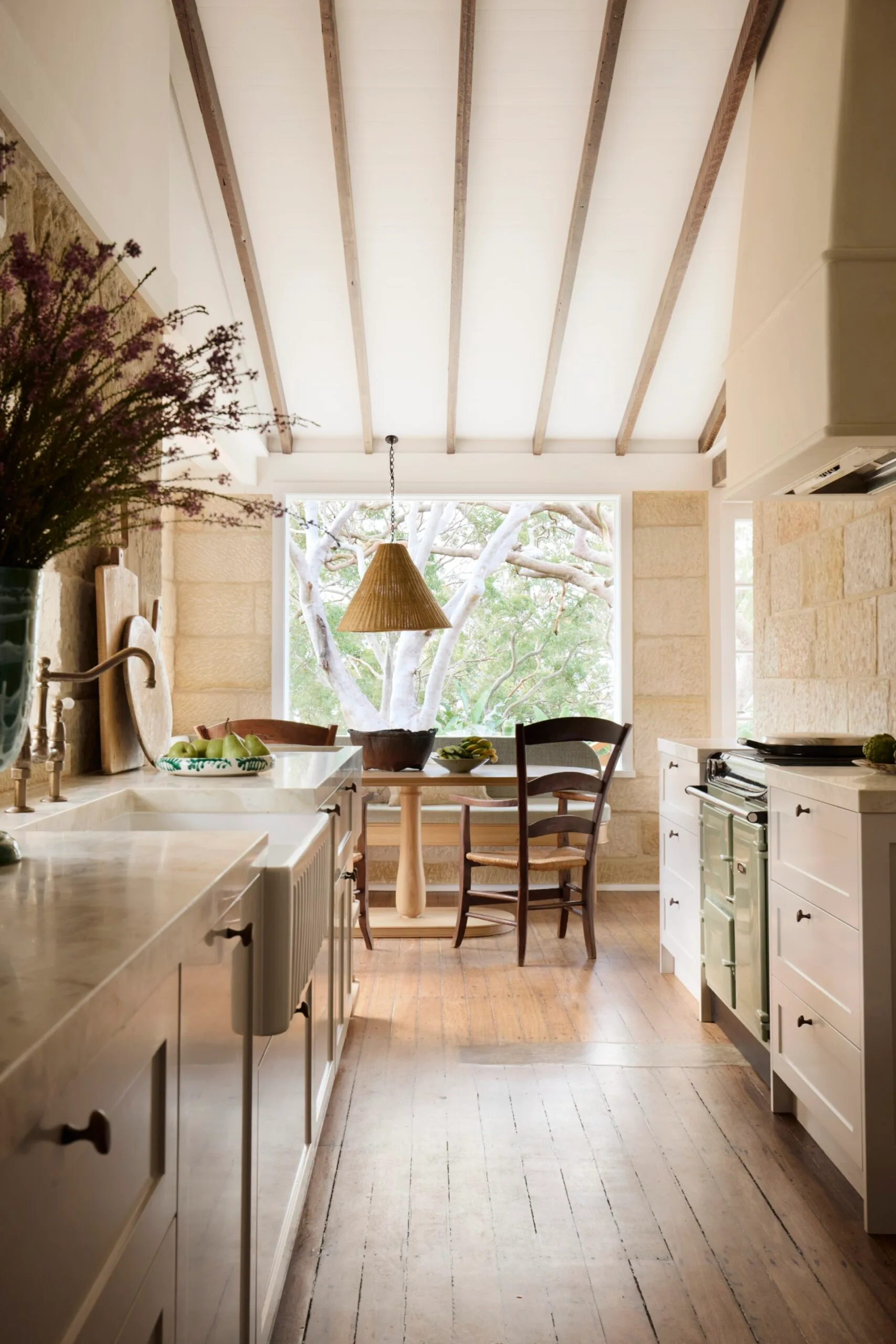 Layering in some of that character in the kitchen, she installed timber beams to the ceiling and specified a textured microcement rangehood with decorative mouldings, an AGA olive green cooker, honed Austral Dream dolomite benchtops and aged-metal hardware.
