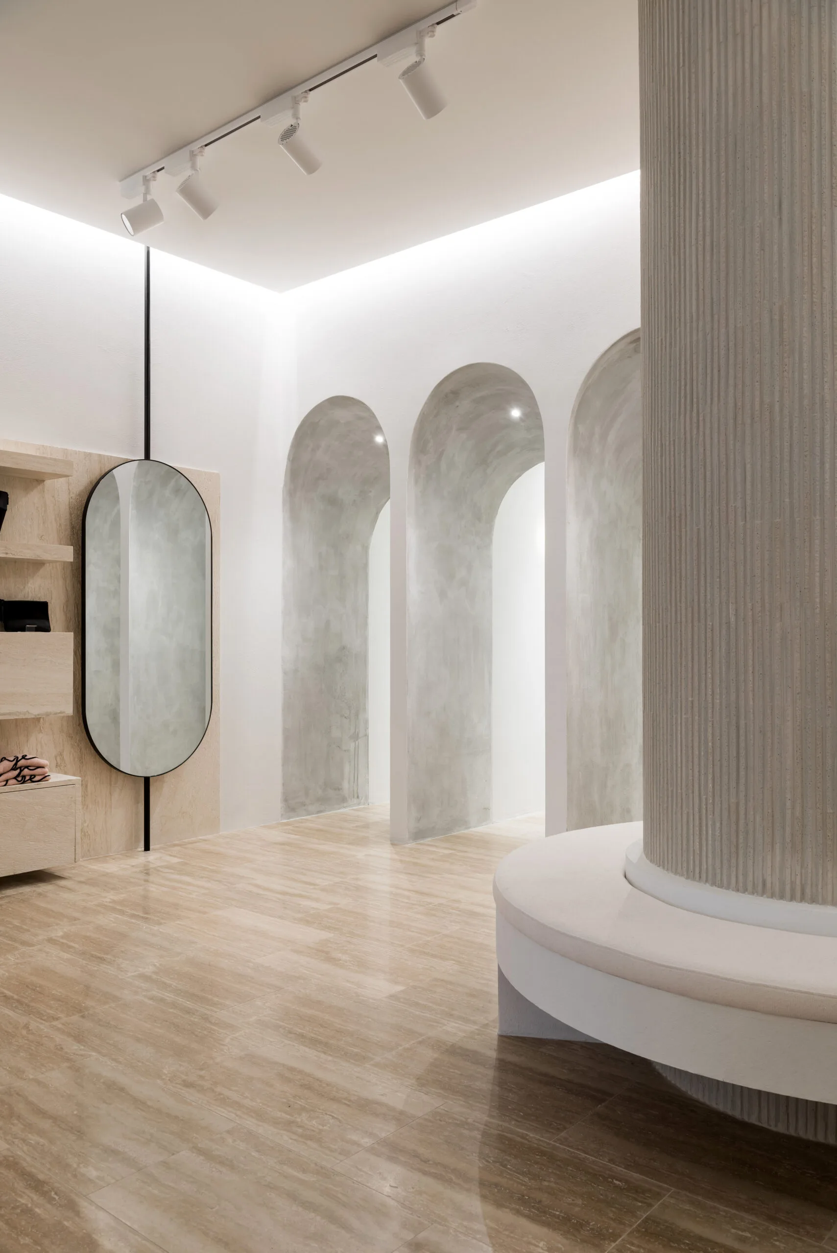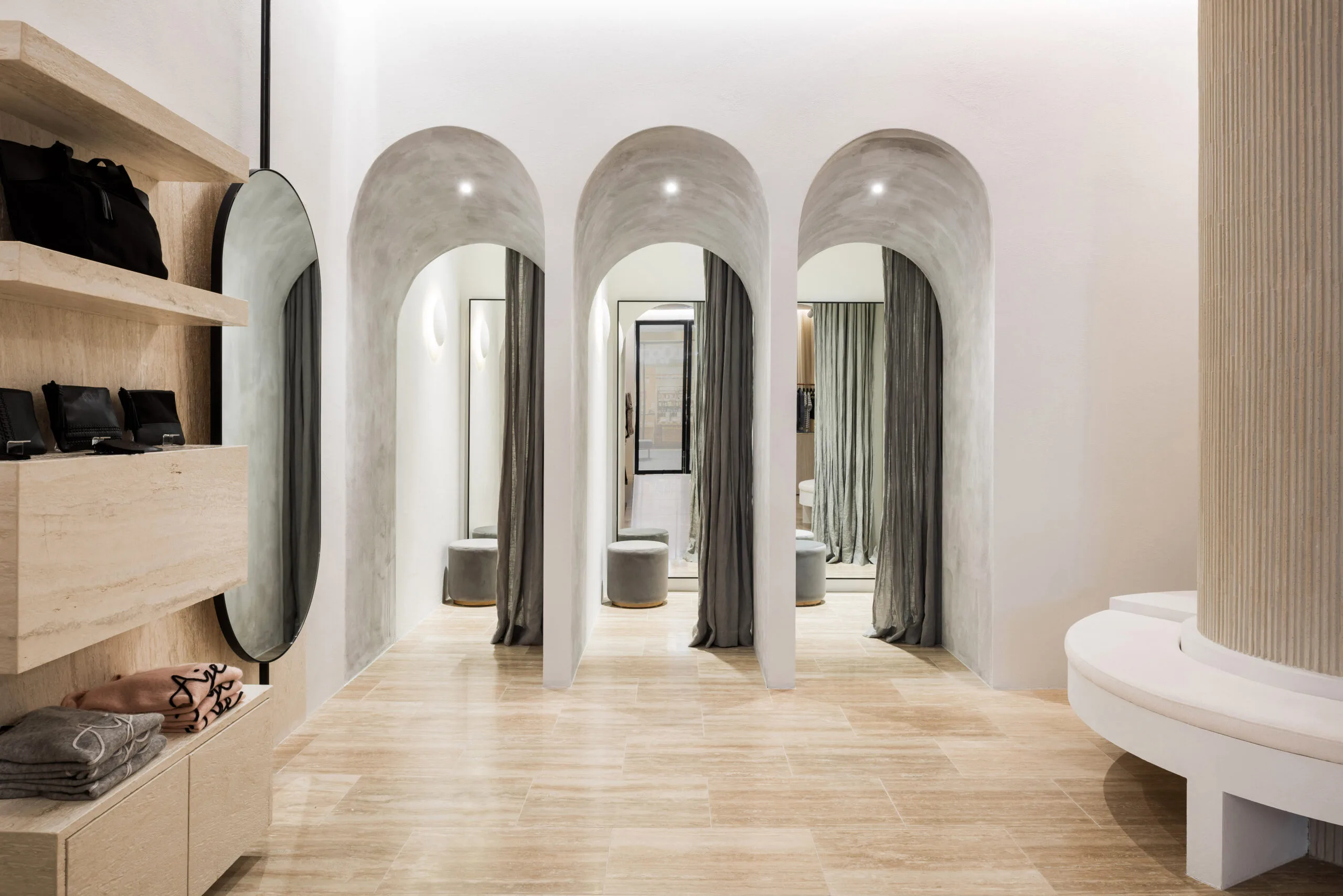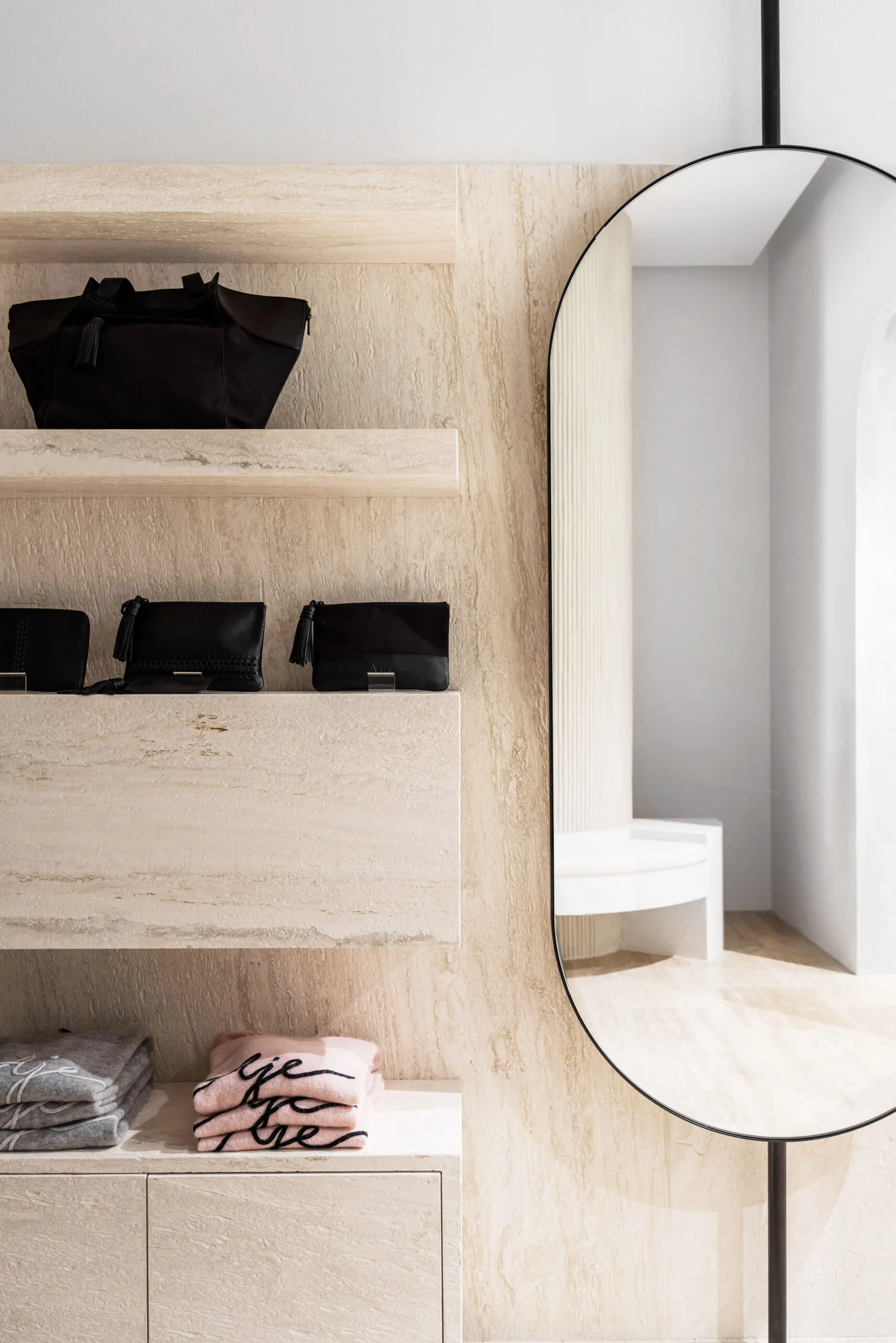 And so the flagship Bec + Bridge boutique in Westfield Bondi Junction is paved in creamy bricks in a chunky herringbone formation, the ceiling has been dropped to create barrel vaulting, arced mirrors are suspended to extend a sense of perspective.