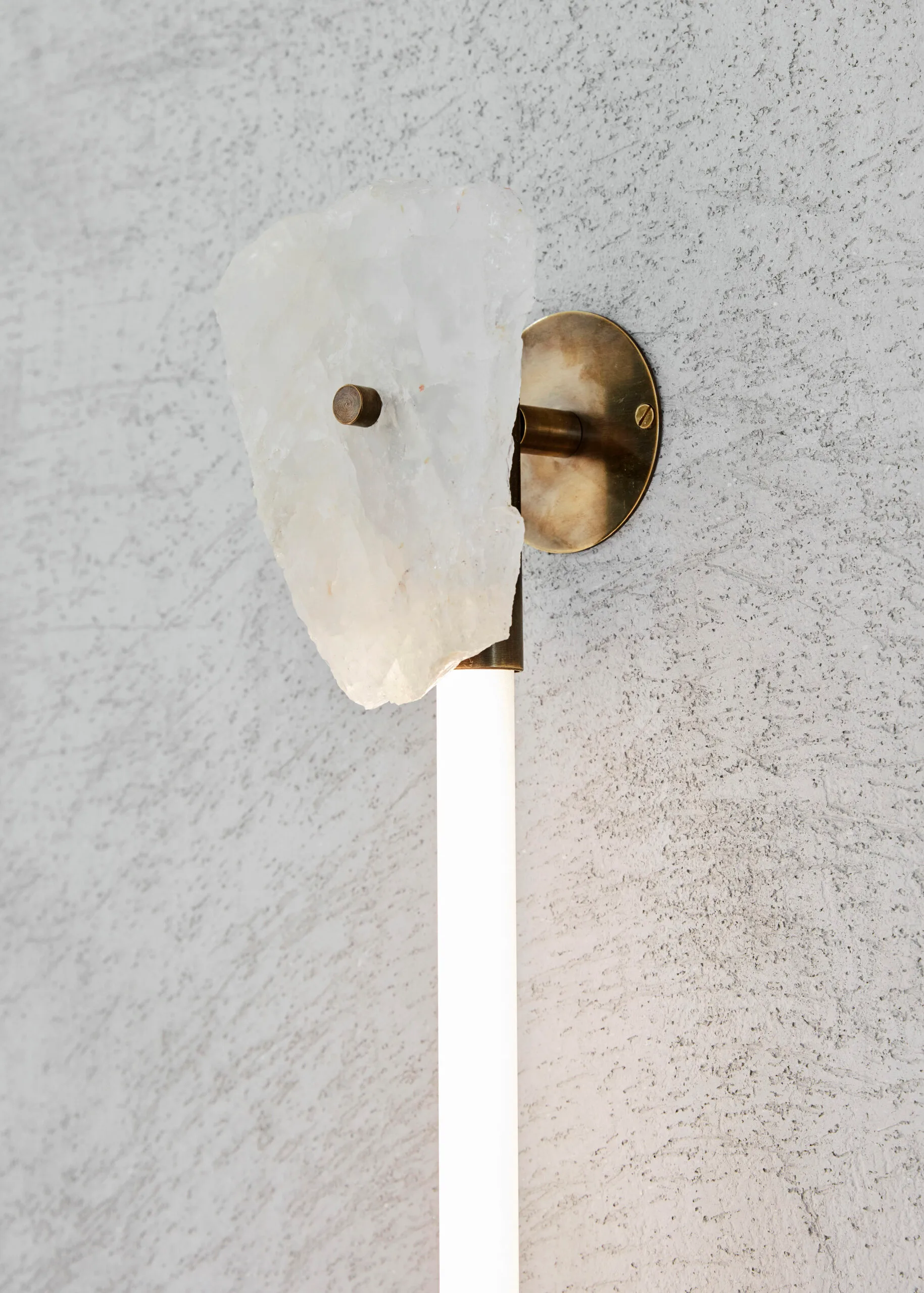 At Viktoria & Woods, Lynch incorporates bespoke quartz crystal, brass and tubular LED wall sconces by Melbourne lighting maestro Christopher Boots to add a sculptural edge to the space.