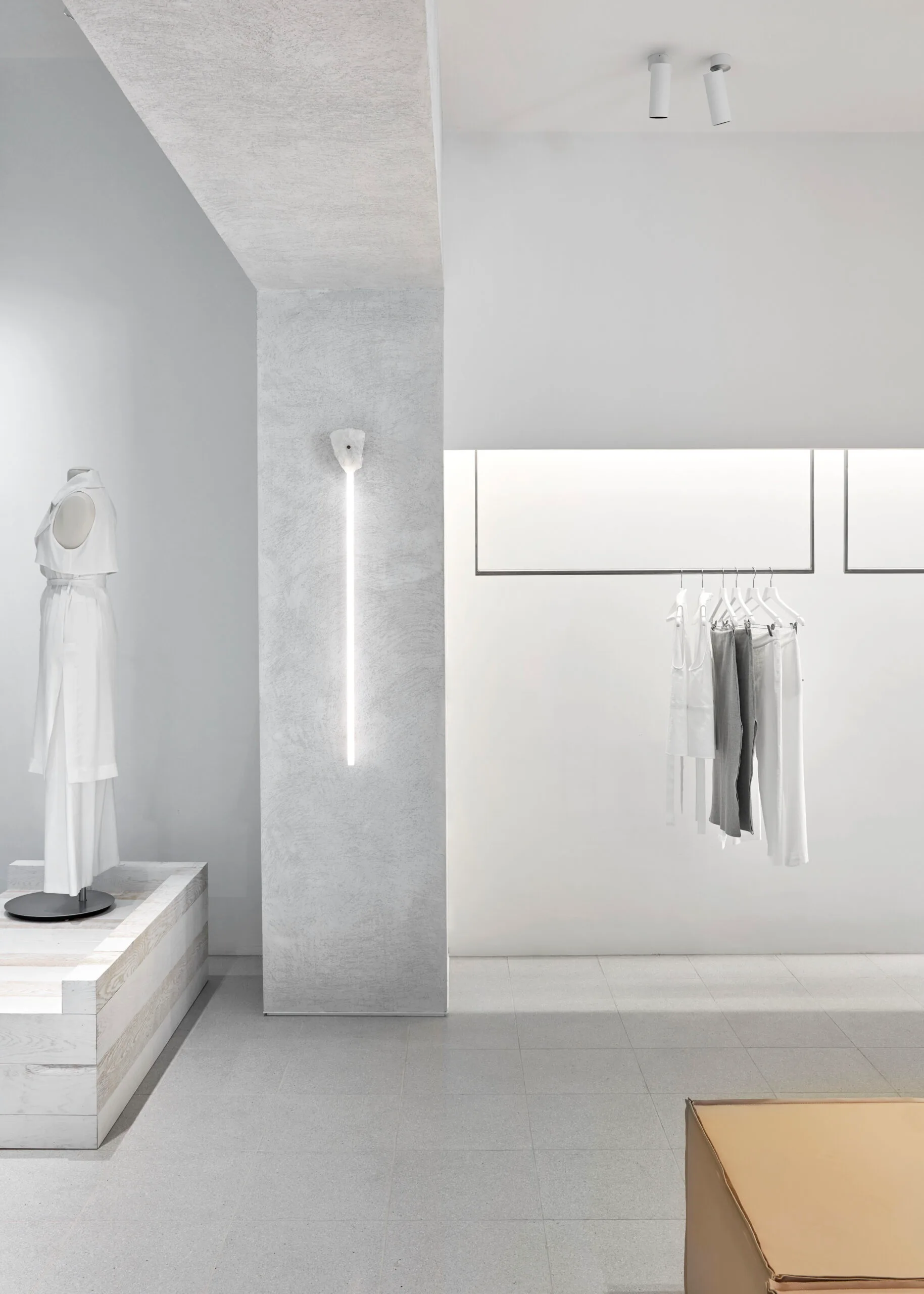 At Bec + Bridge he has concealed all light sources behind the rolling ceiling, allowing it to wash gentle shadows across the room, mimicking daylight in the depths of a shopping mall.