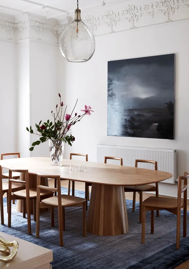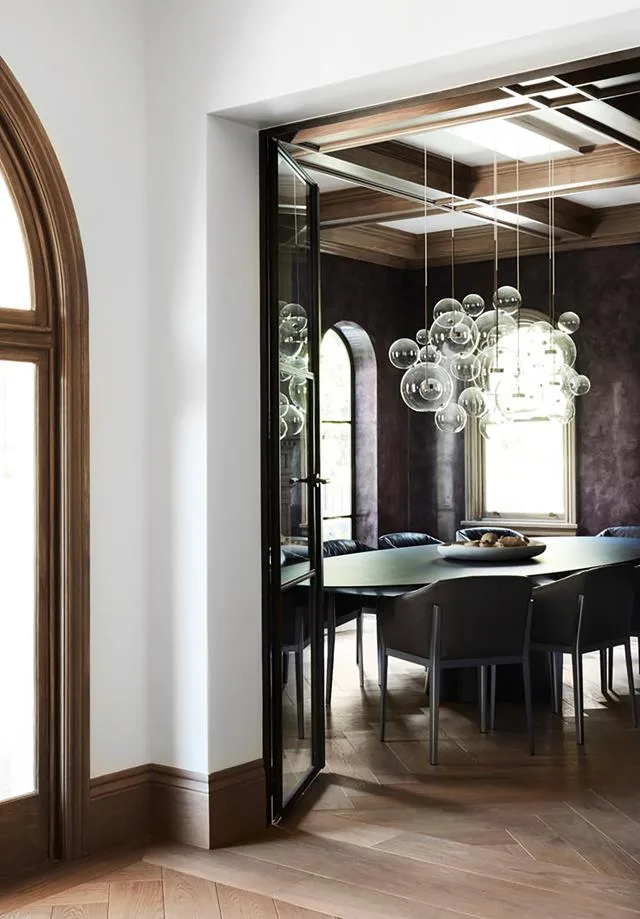 Mardi Doherty put a contemporary spin on this grand old home. In the dining room, a modern dining setting complements the original period features.