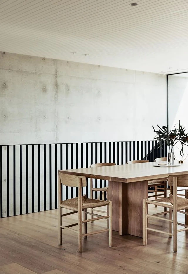 A beautiful timber Christopher Blank dining table takes pride of place in the open plan kitchen, dining and living space of this Mornington Peninsula abode conceived by Jay Earles, director of Planned Living Architects, interior designers Robbie Peirce and Alicia Freeman of Studio Tom, and Made Build.