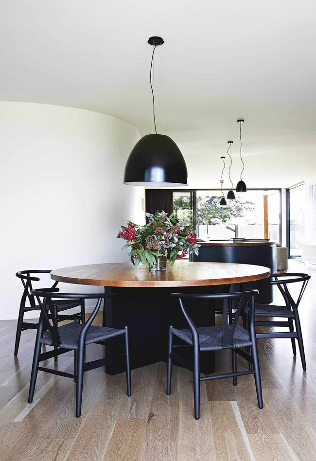 Black chairs and large pendant lights provide a striking contrast to the light wood floors in the dining zone in this contemporary beach house retreat. The black dining chairs and dark base of the timber-topped dining table echo the design of the statement kitchen island.