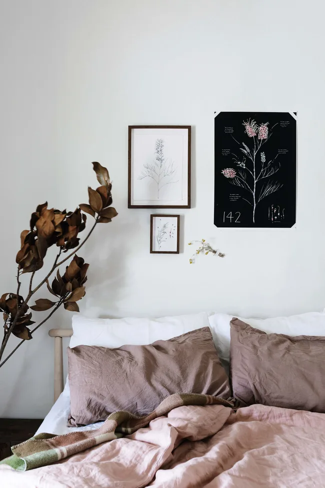 Let the season inspire your decor. Here, dried autumnal foliage, botanical illustrations and bedlinen in soft tones that you would would commonly see on an early winter morning or late afternoon, make this bedroom feel calm and connected.