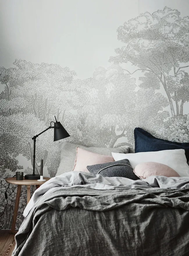 Wallpaper can work wonders when it comes to transforming your bedroom into a warm and whimsical escape. Here, a forest landscape in soft grey tones ties in perfectly with the bedlinen and furnishings, creating a space made for rest and relaxation.