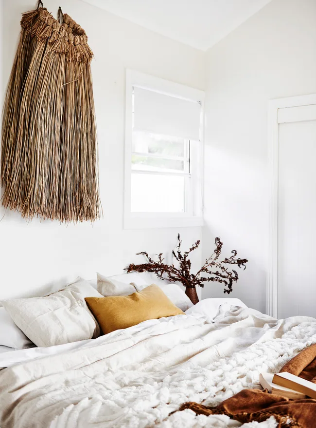 Who said an all-white bedroom can’t feel warm and cosy? A wall hanging in from Barefoot Gypsy and a rust throw from Pampa add an earthy, organic warmth to this cloud-like bedroom.