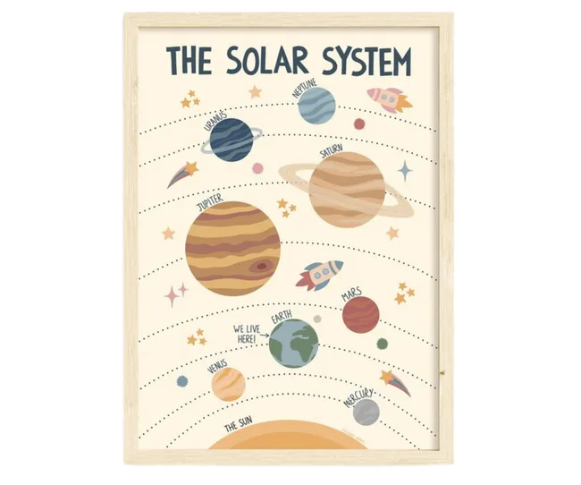 “We live here”, explains the poster, on this little planet making its way around the sun. But you can customise the wording, so a little “Harry lives here” or “Isobel lives here” to help your aspiring astronaut know where the adventure starts. This gorgeous solar system print from the UK comes with a dark grey-blue background as well, which really lets the planets pop. There are five colour schemes to choose from.