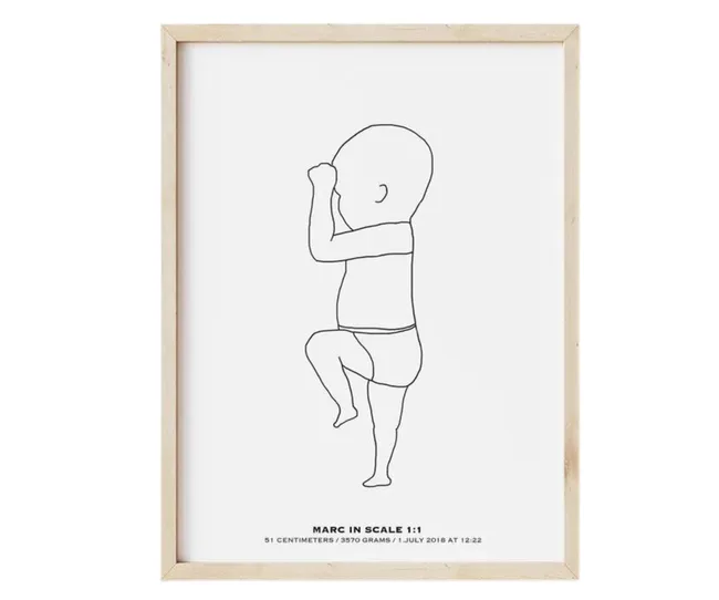 Honour a new addition to the family with this very personal poster for the nursery. The MiNIPOSTER is an illustration of baby in scale 1:1, so you can always remember your tiny little person’s birth size. This custom wall art is a constant reminder of how small your babies were on the day they were born, and how much have they grown since. We love the single-line illustration and the personalised baby name at the bottom of the poster where the baby’s length, weight and birth date are also printed.
