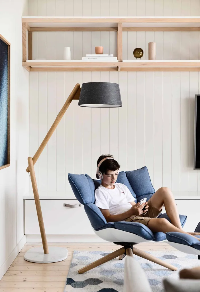 Chill factor Kids’ downtime can be as simple as a podcast and a comfortable chair. In this space by architects Pleysier Perkins, a Husk chair by B&B Italia does the job nicely.