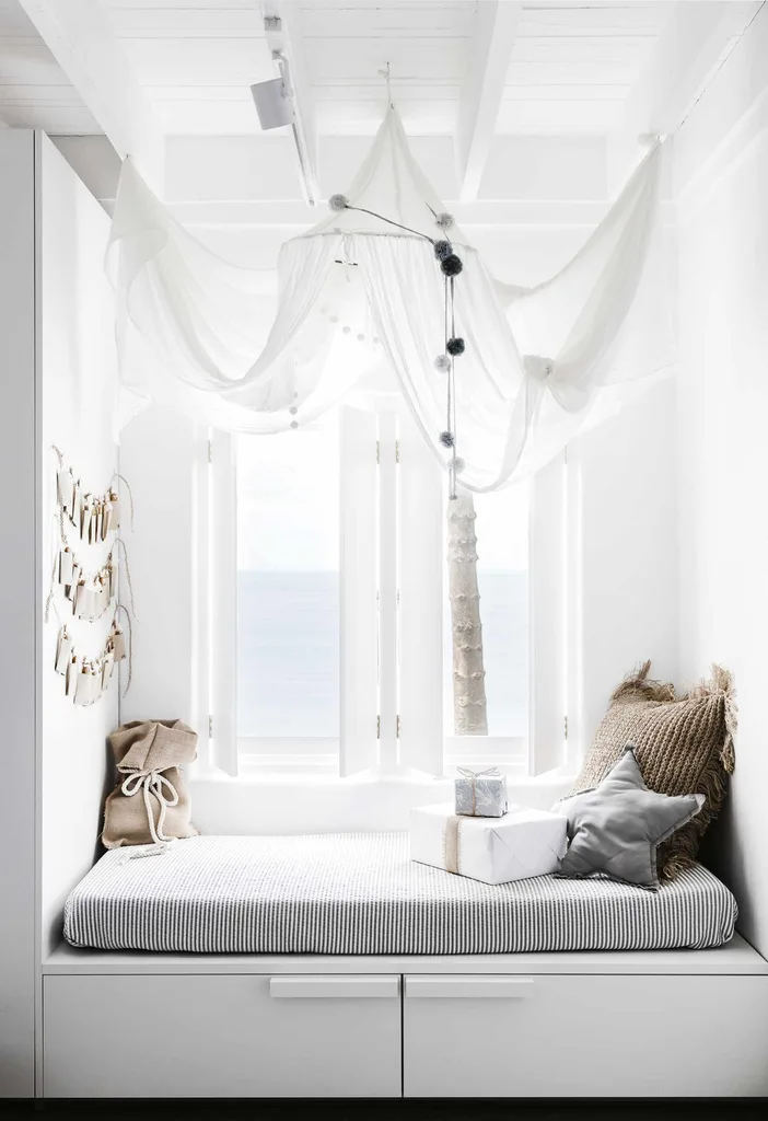 Multifunctional spaces In this all-white Mediterranean home a clever window nook in the kids’ room provides additional seating and reading space, as well as extra storage.