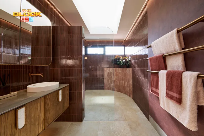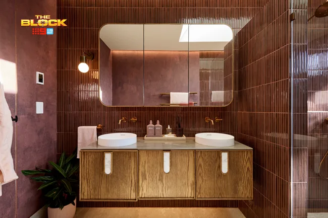 Dubbed “mid-century western” by the judges, Emma and Ben’s earthy colour choices prove you can definitely use non-traditional colours in a bathroom. Their sophisticated warm-toned palette features three complementary tile choices, a timber vanity and copper tapware. Curved lines repeat throughout the space, softening its hard edges, while giving the space a fresh, modern feel.