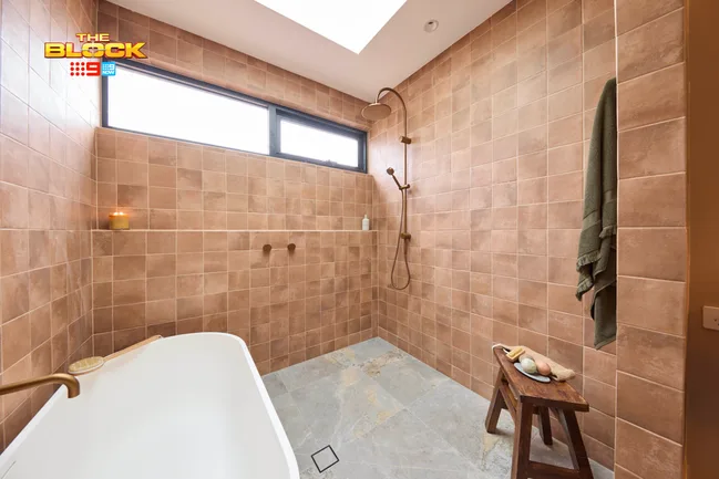 The couple opted for a screen-free shower, emphasising the sense of spaciousness and creating a luxe, spa-like feel that earned high praise from the judges. A small timber stool adds an element of country style to the bath and shower space.