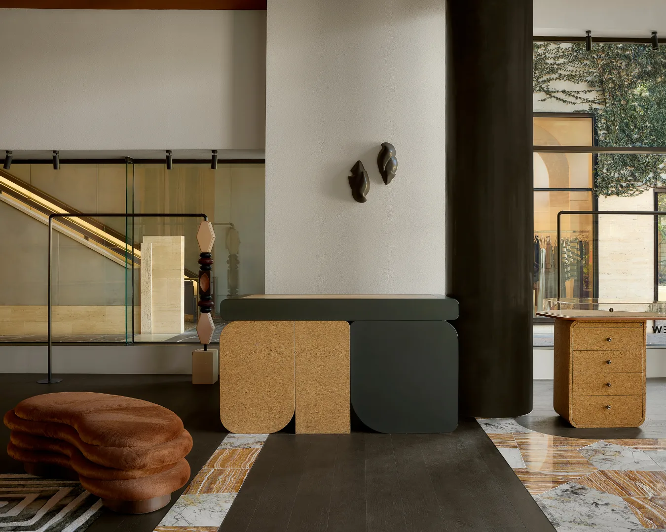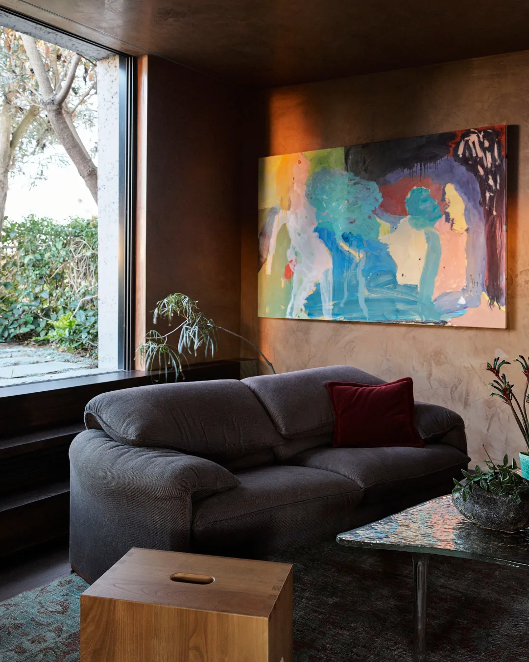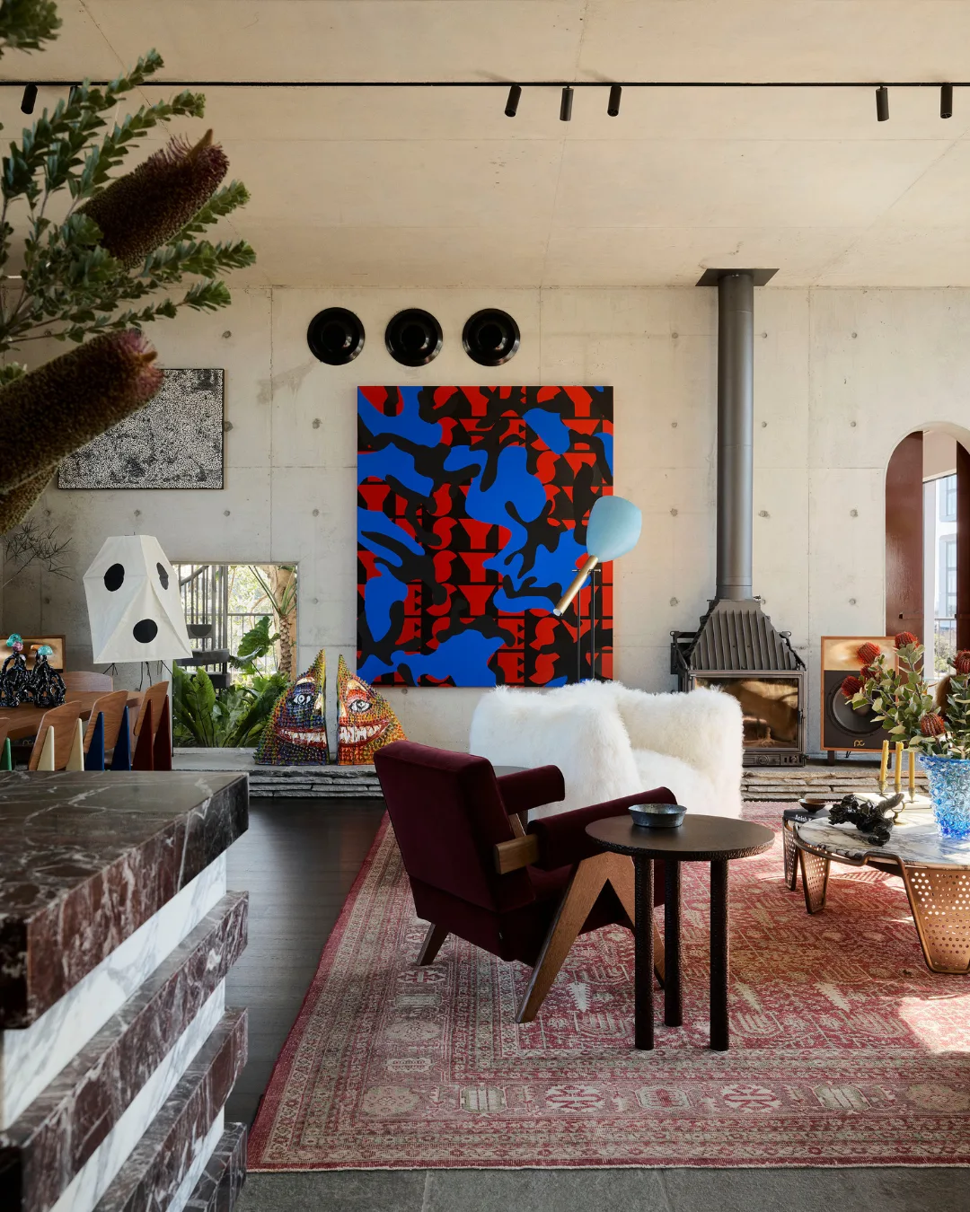 Inside, a palette of earthen sunset colours, textures and motifs extends to the furniture such as the pink Carlo Scarpa ‘Argo’ table, vintage cane and coarsely hewn timber pieces, rope trims and terrazzo tiling, all set against soft white-painted timber surfaces.