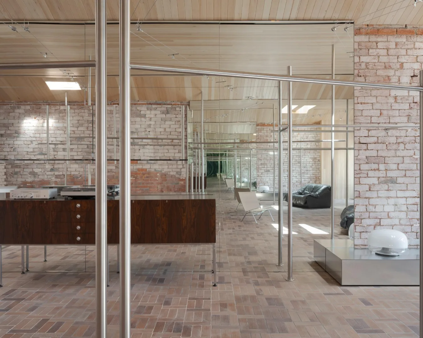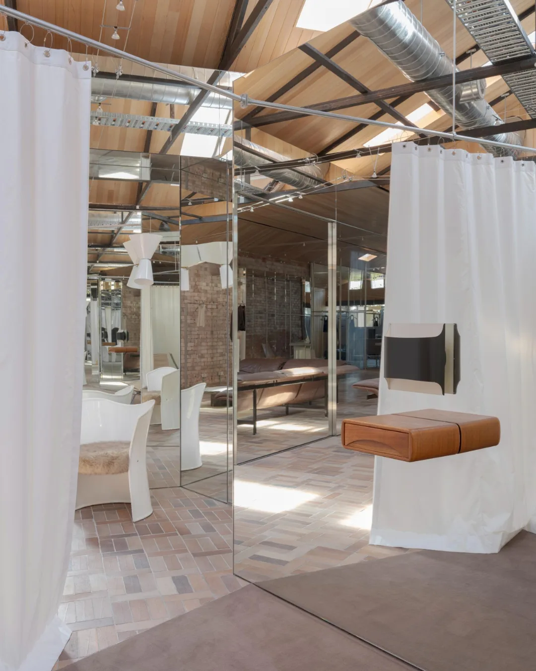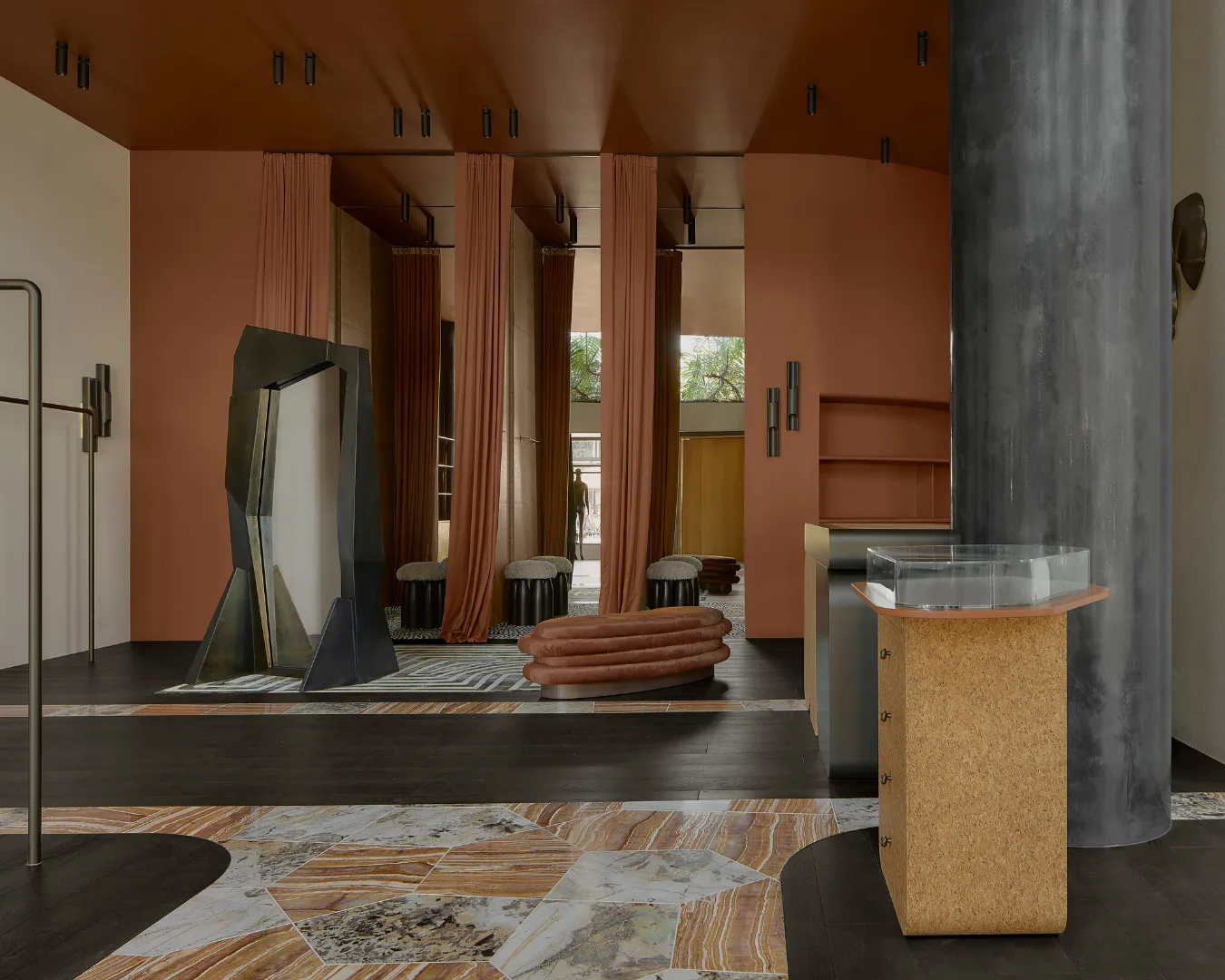 Inside, a palette of earthen sunset colours, textures and motifs extends to the furniture such as the pink Carlo Scarpa ‘Argo’ table, vintage cane and coarsely hewn timber pieces, rope trims and terrazzo tiling, all set against soft white-painted timber surfaces.