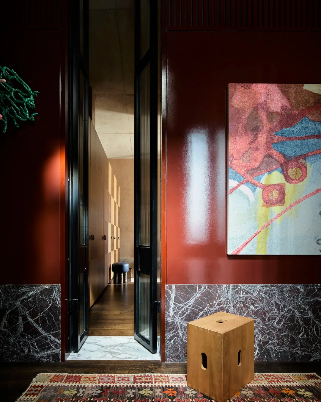 In the transformation of this Sydney apartment, owner and architect Stefania Reynolds of Studio Johnston devised some clever spatial interventions to create a more open environment for her family of four. The galley kitchen was closed off at one end and the adjoining dining room converted into a separate home office, while a column in the kitchen was removed to open up the living and dining area. “Deleting that column unlocked the project and allowed us to organise the main space into seamless, overlapping zones, like a Venn diagram of how we actually occupy the home,” says Stefania. “The open-plan layout fosters more quality time spent with family, promoting a feeling of togetherness.” The rich palette was inspired by Stefania’s Greek heritage and includes joinery in light apricot and a red Tiberio marble for the benchtops and splashback. “They’re the colours of my Corfu childhood,” Stefania shares. “Peach was the colour of my bedroom and the family house had a lot of terracotta, textured walls and brass details. For me, nostalgia, warmth and a sense of belonging are beautiful things to bring into daily life.” The kitchen island is now a central hub of activity and the dynamic space stimulates creativity and boosts wellbeing for all.