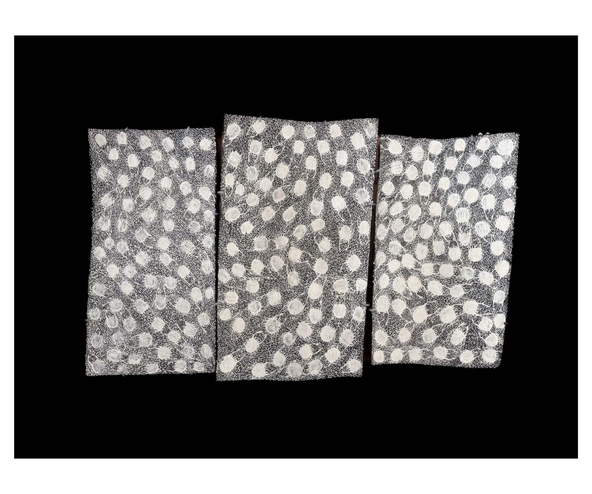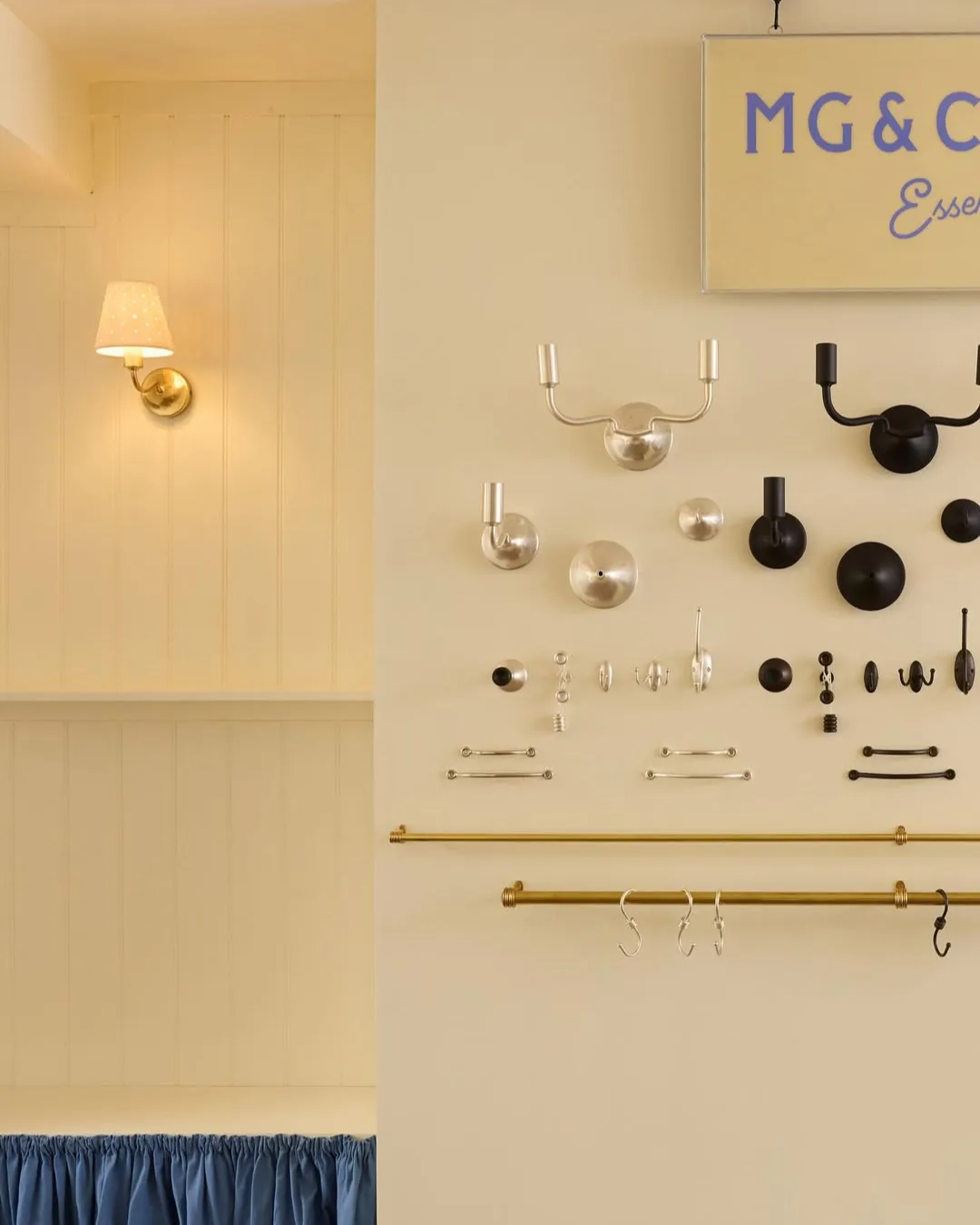 Flanking the bathroom door on the right is a ceramic sconce by Ceri Müller with a beaded hat by Lucy Folk on the other side. The bathroom has a custom concrete vanity by Tamsin Johnson. Tapware from Astra Walker. Terrazzo-tiled floor. Custom ceramic sconces by Ben Mazey sit either side of the hexagonal mirror from Tamsin Johnson Showroom. (Photography: Anson Smart | Styling: Tamsin Johnson)