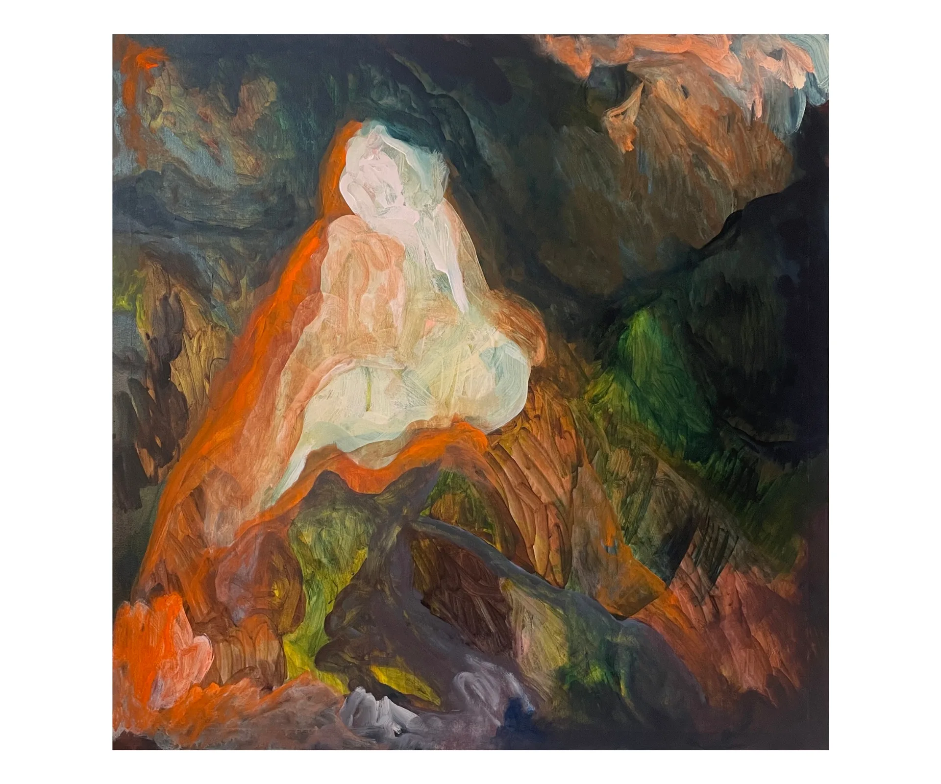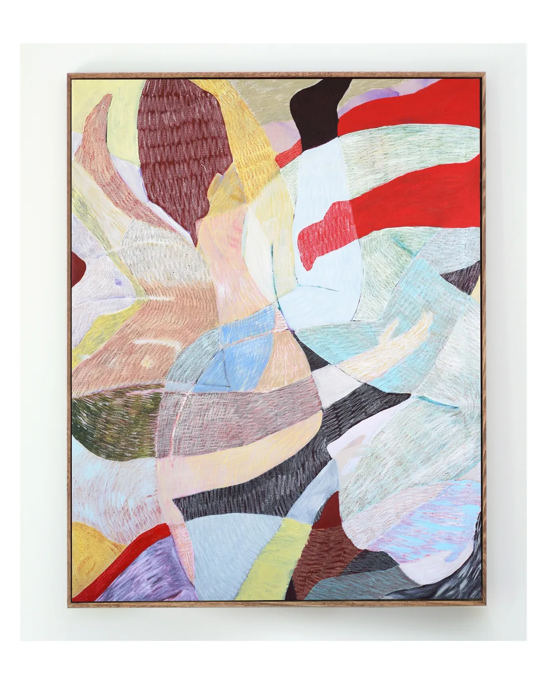 A stairway landing with a pendant lampshade and bright artwork hanging on the wall