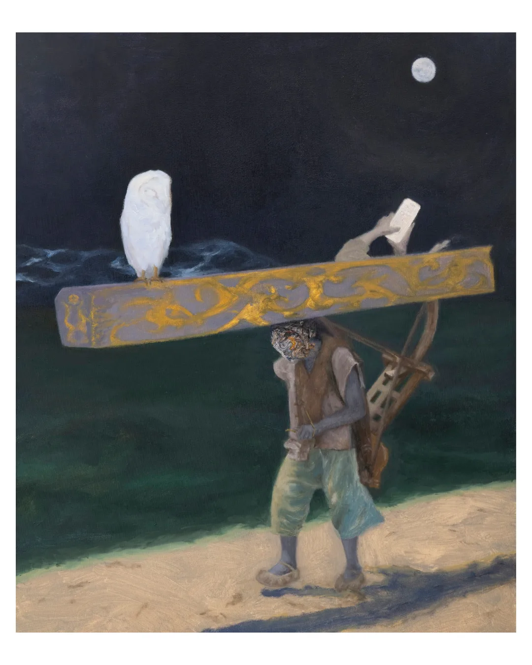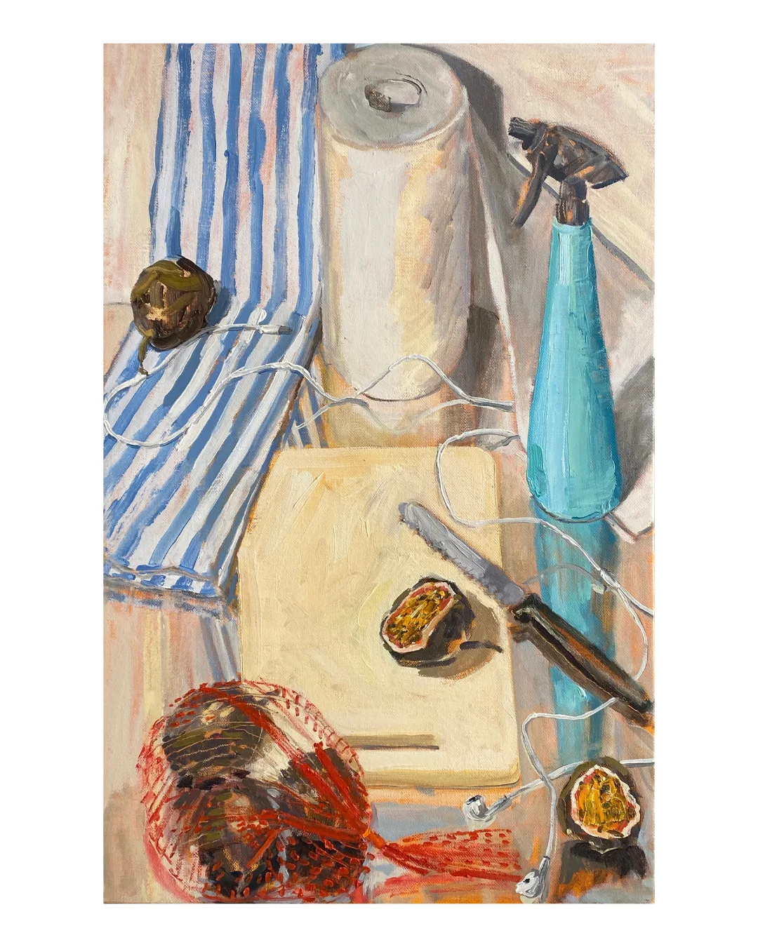 The sunny living room has a Tolv ‘Portobello’ sofa. Carmen D’Apollonio lamp. Vintage rattan stools from the Marché aux Puces in Paris. Makinti Napanangka artwork. Custom ceramic wall sconce by Ceri Müller. Custom shelving by Lex Williams. Vintage oil painting is a Paris market find. (Photography: Anson Smart | Styling: Tamsin Johnson)