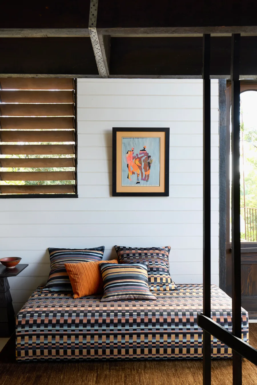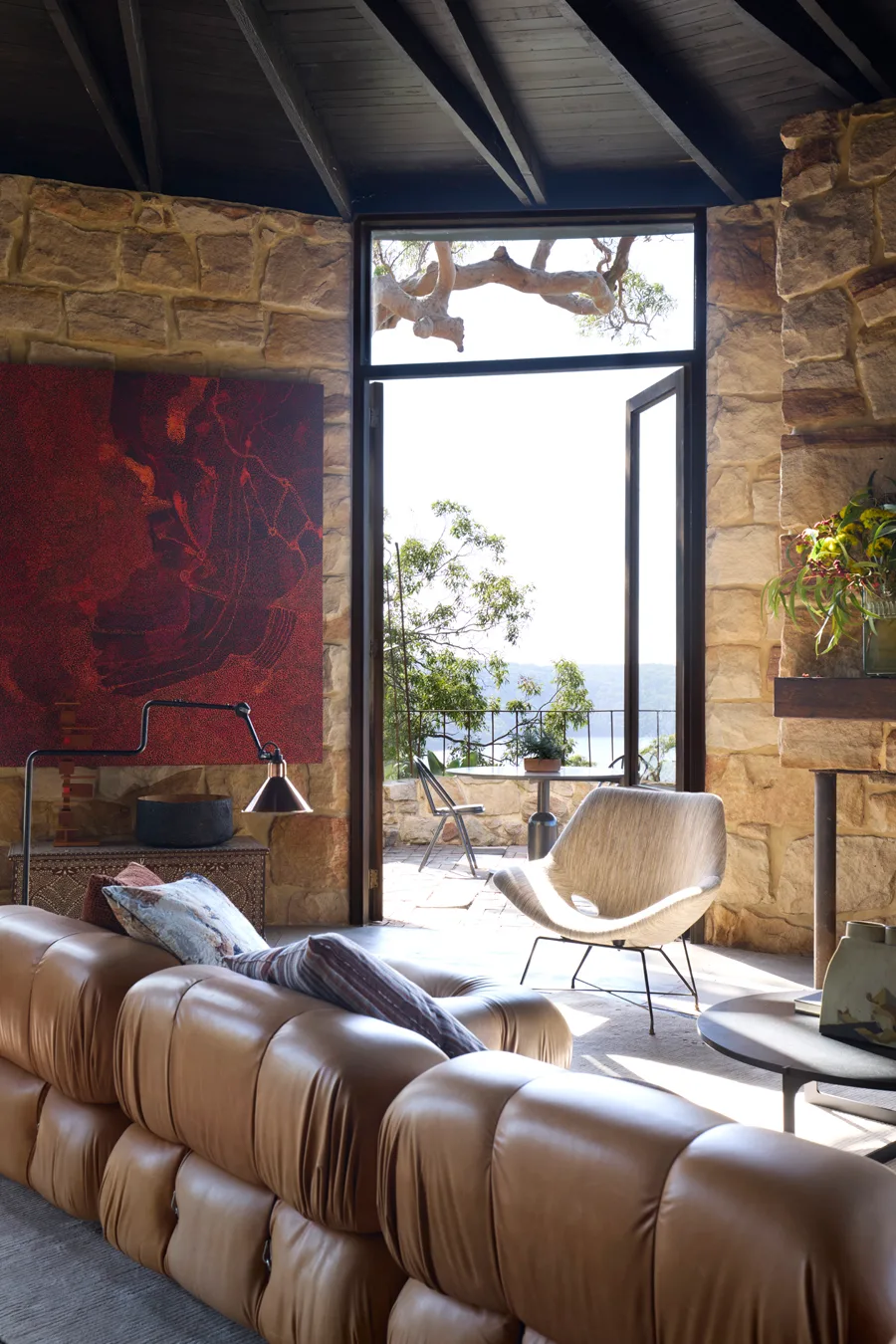 The interiors, which won the John Verge Award for Interior Architecture at the 2025 NSW Architecture Awards, are shaped by Fiona’s longstanding collection of art, furniture, ceramics and textiles, many from her own brand, Innate. The layered richness of materials is in tune with the building and the land, tying it all together.