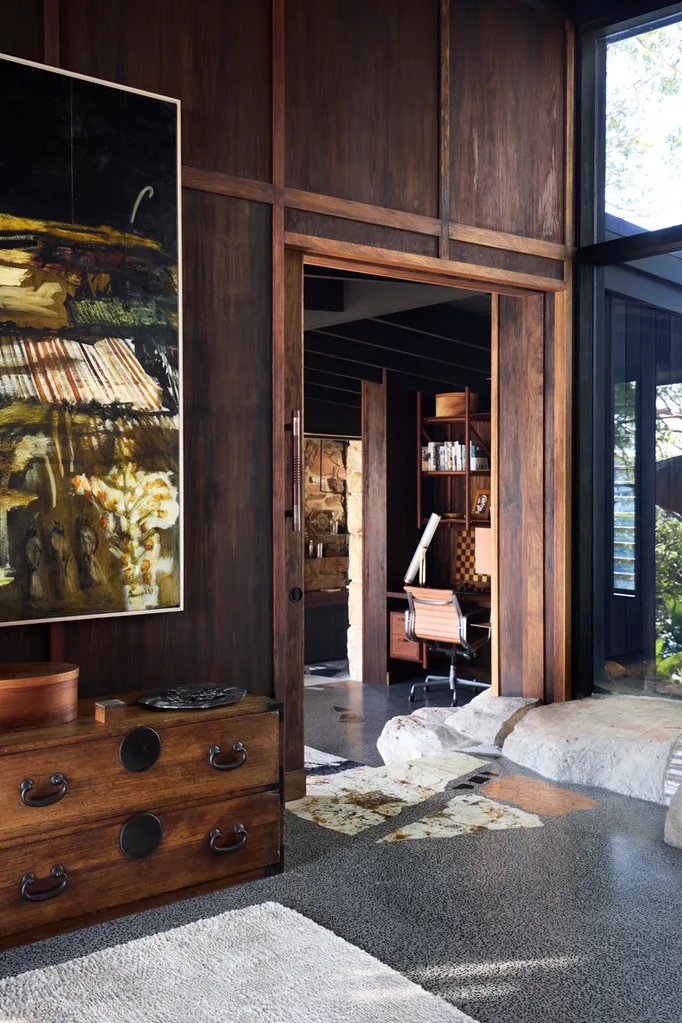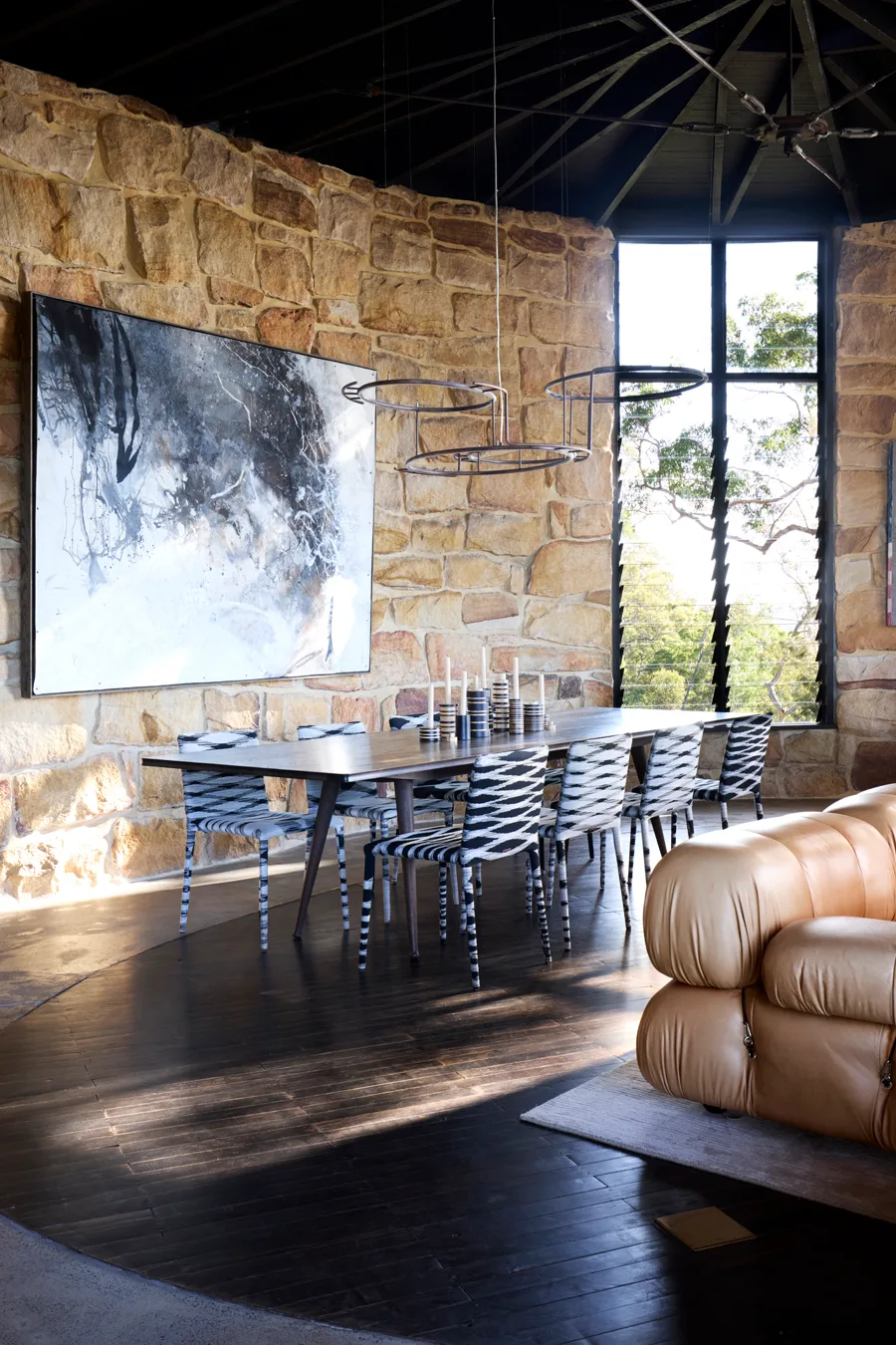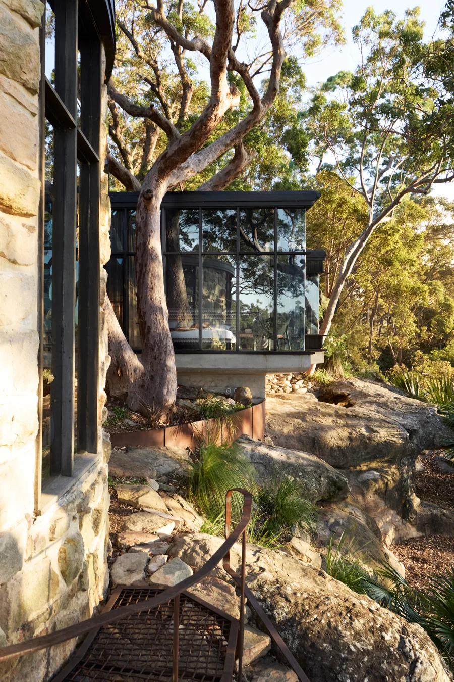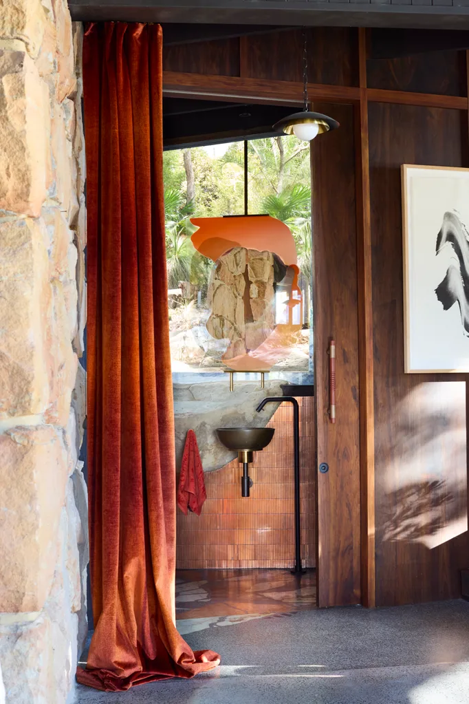 “There’s an idea of leaning into unpredictability,” Fiona notes. “There are moments when the house still surprises.” Nowhere is this more apparent than in the way the house melds with the land. Instead of resisting the rock shelves, the design absorbs them. A boulder punctuates the powder room; another becomes part of the study wall. In the new wing, glass slices into the rockface with elegant precision. Fiona was involved at every stage, down to the smallest details. “Those vintage bronze door handles kickstarted the whole aesthetic,” she points out.