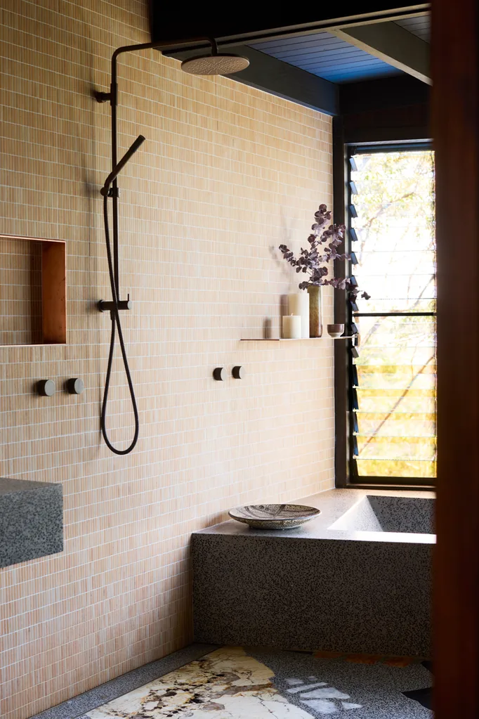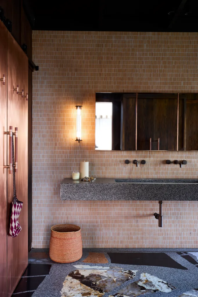 That conversation unfolds through materiality. Stone meets terrazzo, hand-waxed copper glows beside timber, blackened ceilings frame shafts of sculpted light.