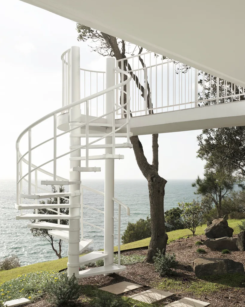A central fireplace hub and joinery unit is at the heart of the ground floor, with the kitchen, dining and living areas tucked into their own respective corners. From the communal area, there’s a panorama out to the water, which glitters all the way to Avalon Beach and its headland. Accessed by a spiral staircase unfurling to the garden, the whale-watching platform provides regular sightings at migration time.