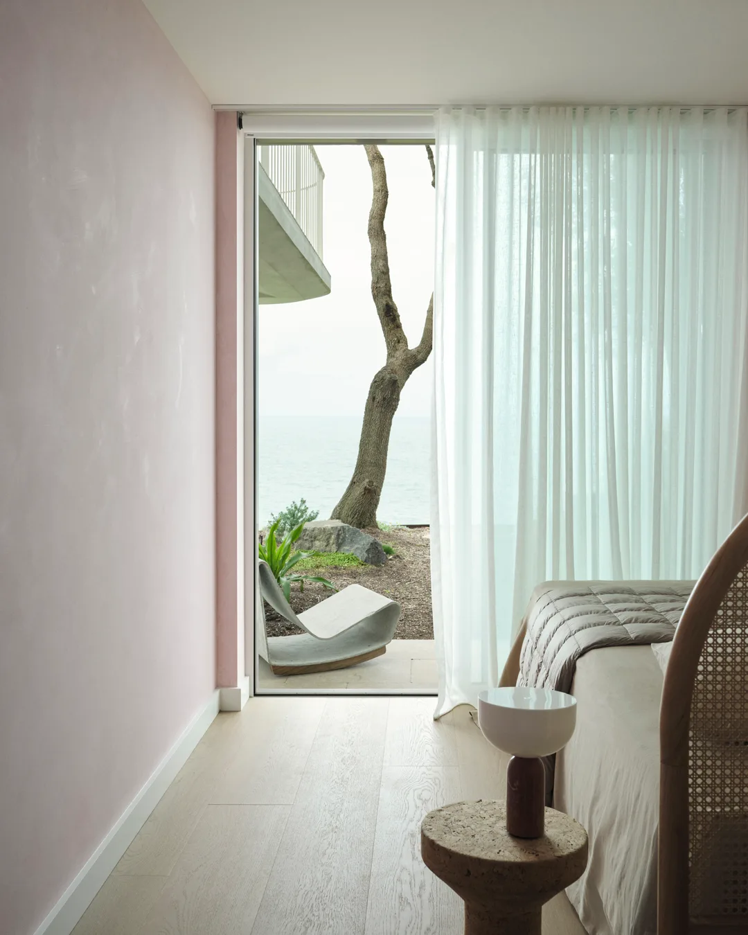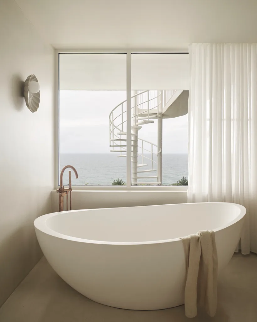 This involved gently pulling apart and recrafting the interiors to “echo the coastal setting”. New elements included creamy microcement walls and stone slabs, fresh oat colours for the furniture, and grasscloth wallpaper and jute rugs. The result is a home with “warmth, resilience and longevity”, says Morgan.