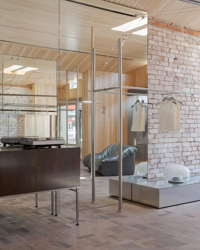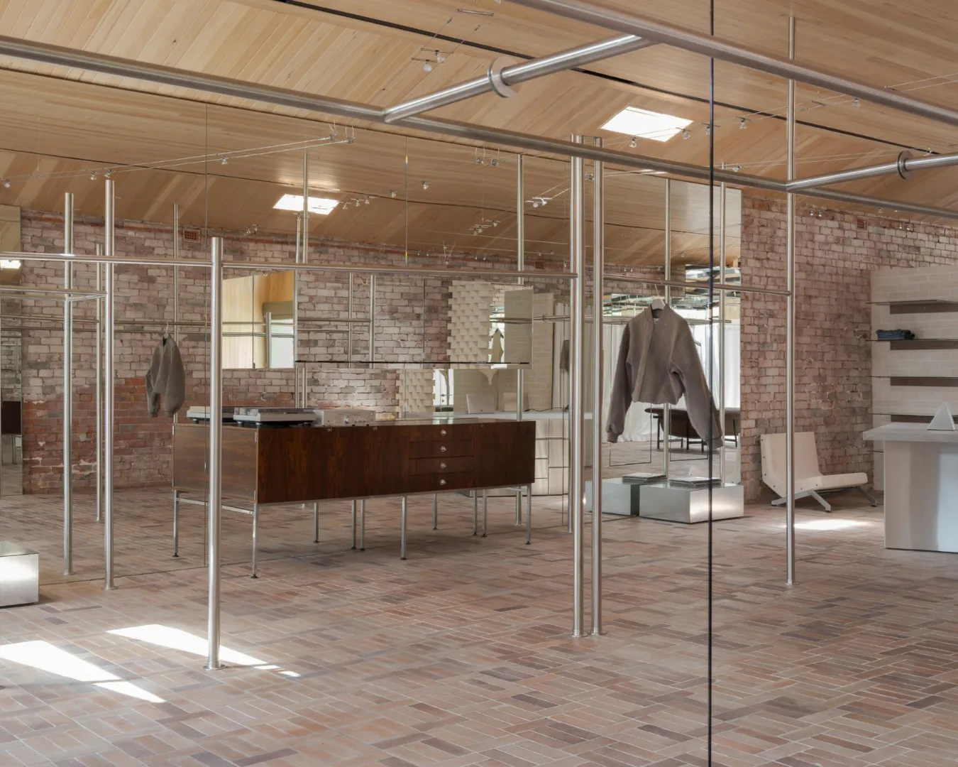 The boutique references 1980s and 1990s Australian rag-trade warehouses, alchemised for contemporary use. In this approach, architectural features – stainless and galvanised steel, concrete, mirror and trapeze lighting – are juxtaposed against original brickwork and exposed timber trusses, that were preserved. Brick tiles on the floor echo the walls, while the rebuilt ceiling – timber boards left to age – and the natural light that filters through restored skylights give the long plan a sense of permeability and volume.