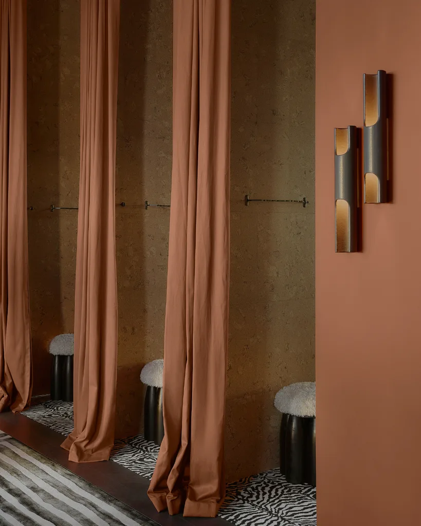 Upon entry, soft transitions of light vacillate across textured walls and the polished surfaces of near-black polished plaster columns. The layout is open, with curved partitions providing separation and guiding circulation through the store. Attention to scale and sightlines throughout the space was prioritised.