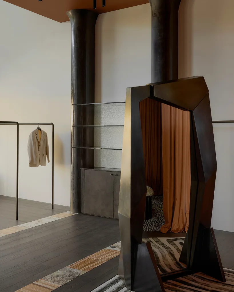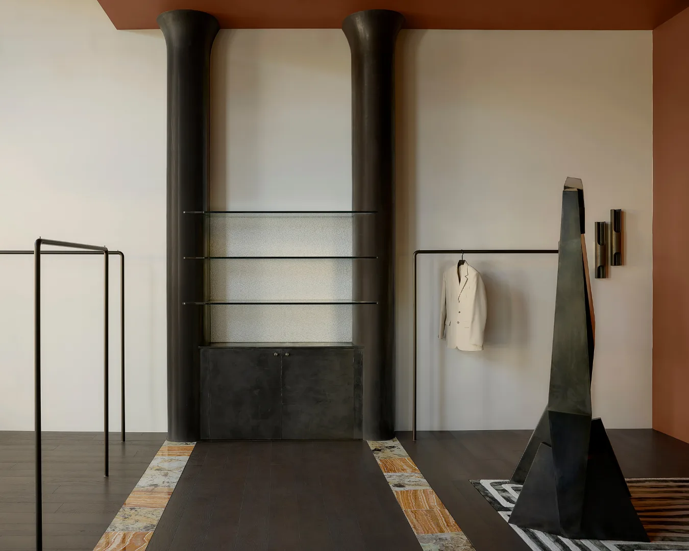 Each room flows into the next, with detail focused on finish and composition rather than ornament. The arrangement allows merchandise to be displayed within an architectural framework while maintaining openness.