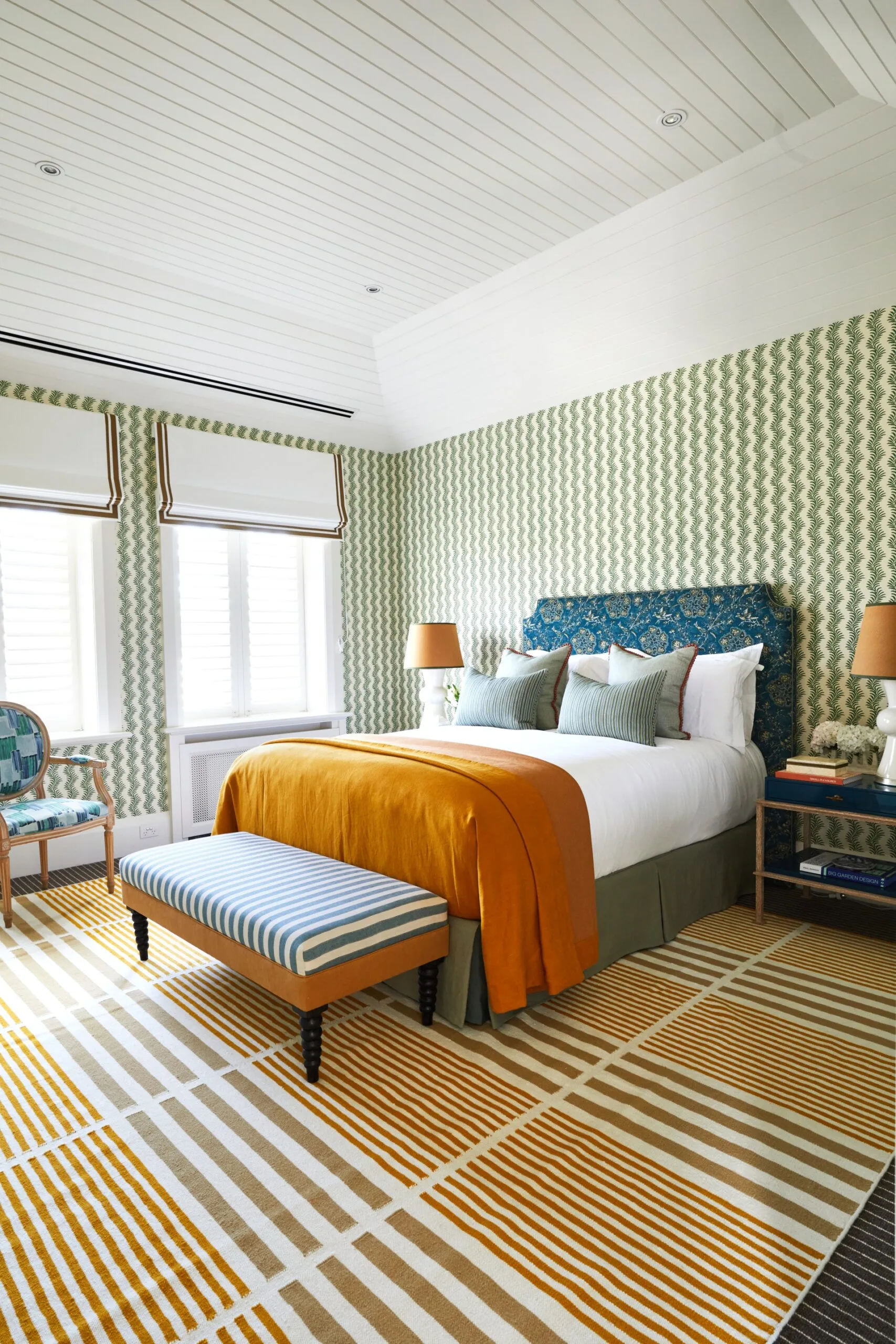 Upstairs, renovating the kids’ bedrooms was put on pause until their tastes mature. The guest room and master suite are a lively combination of upholstered classic stripes and floral motifs that contrast with graphic rugs and Indian block-printed textiles. Furniture in the primary suite is a mix of handsome slipper chairs, custom footstools and handmade oak bedside tables.