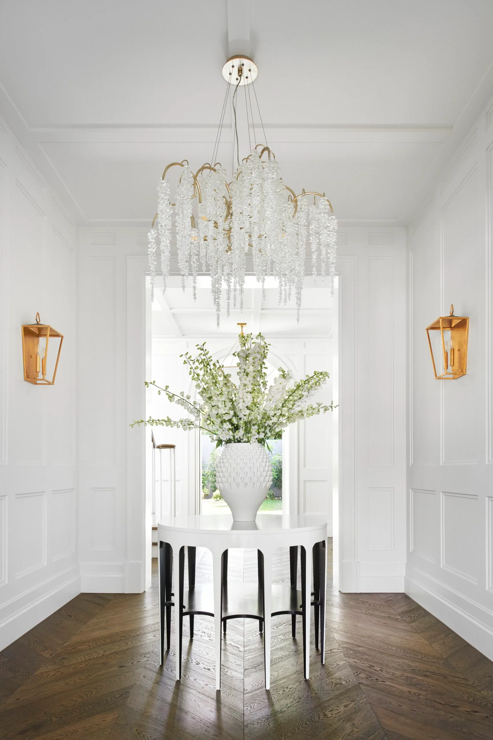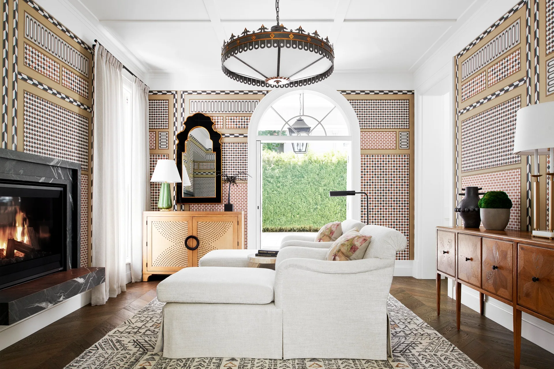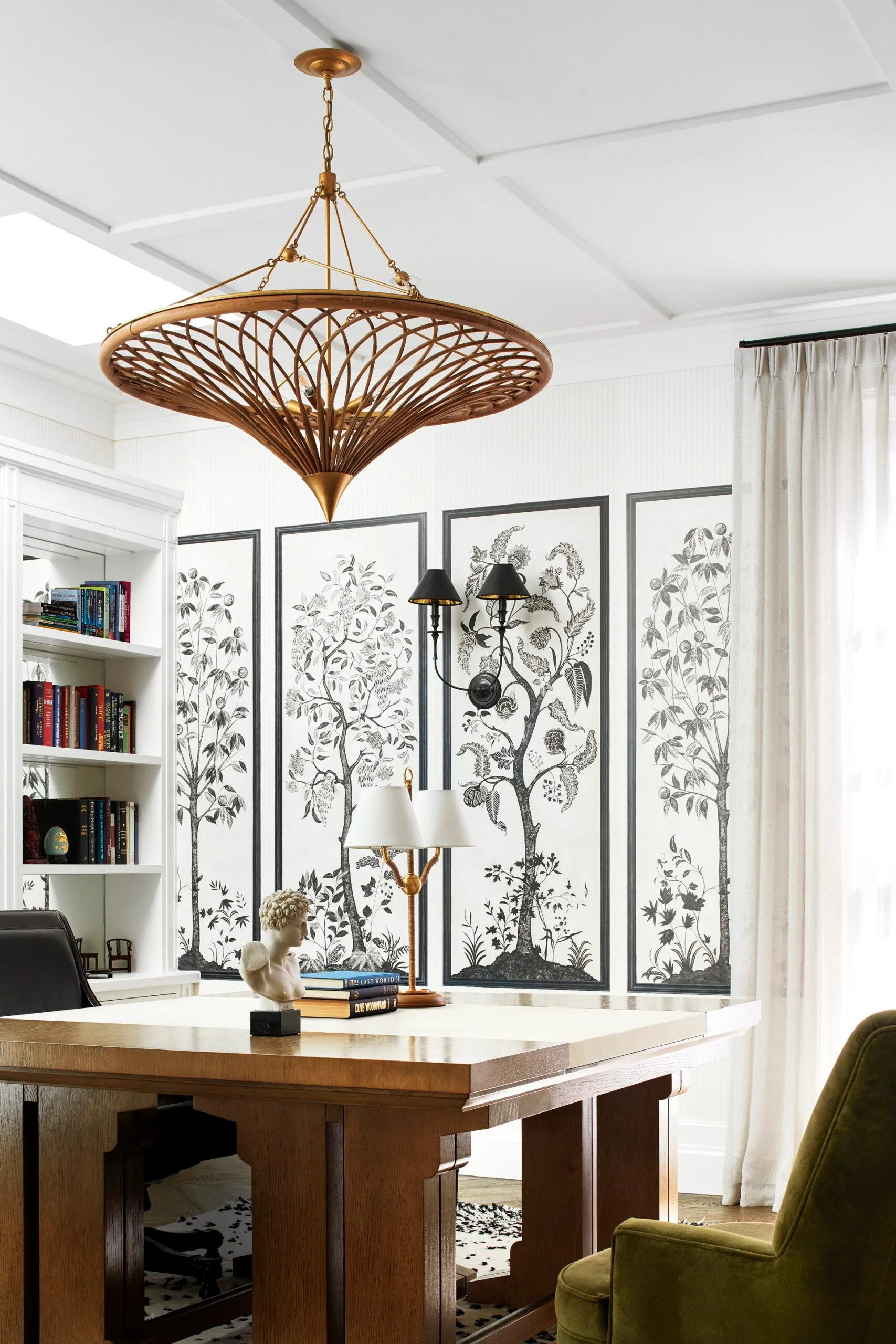 A coffered ceiling adds gravitas and sophistication in the open plan. Wall panelling in the hallway, ceiling bulkheads and chevron oak flooring lend a classic elegance, highlighted by crisp white walls with gold accents. Throughout, the husband’s prized wallpaper stars, with a striking Moroccan-style Schumacher iteration in the front sitting room forming part of a portfolio that includes English botanical prints and Oriental-inspired panels by the likes of Cole & Son and Lewis & Wood.