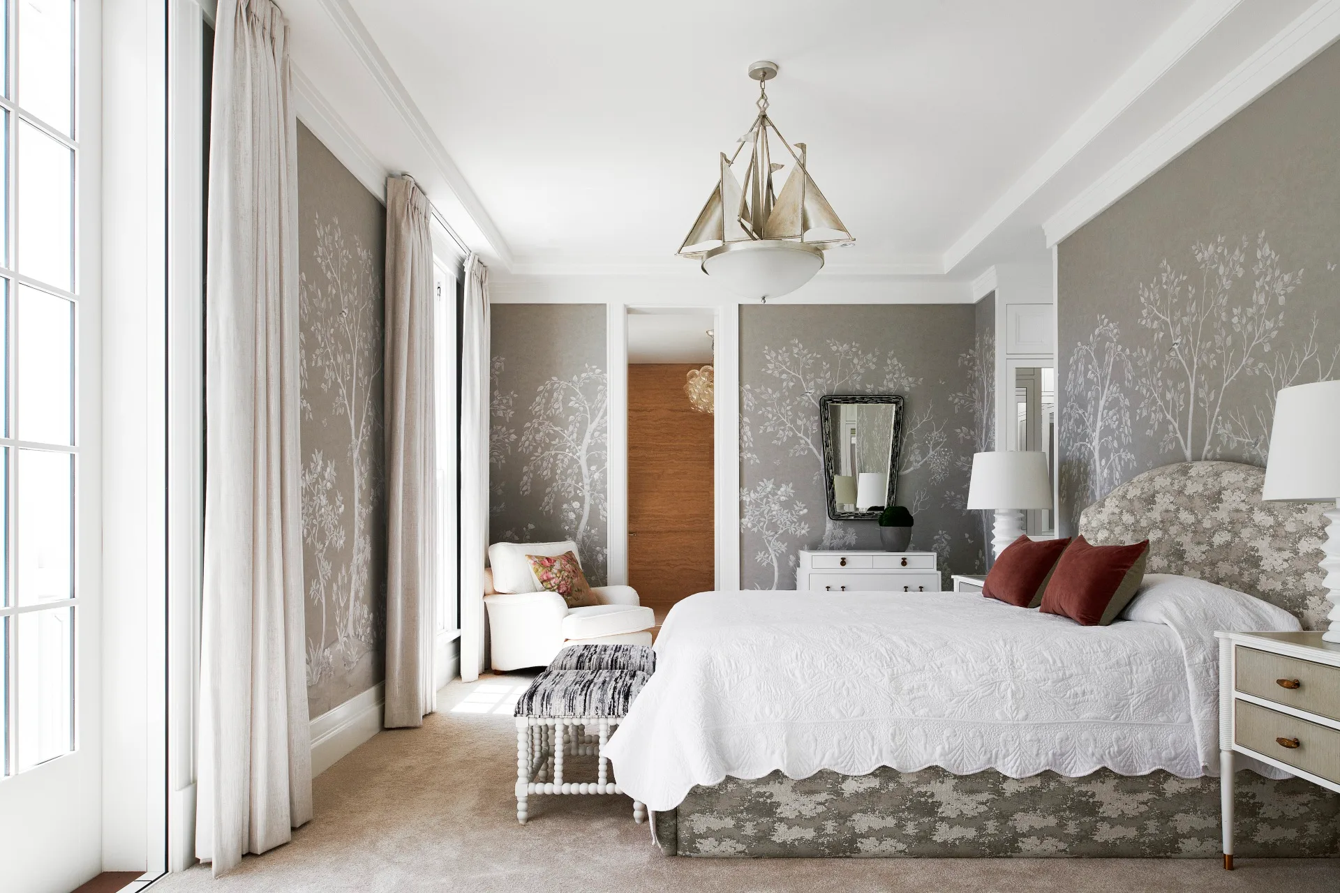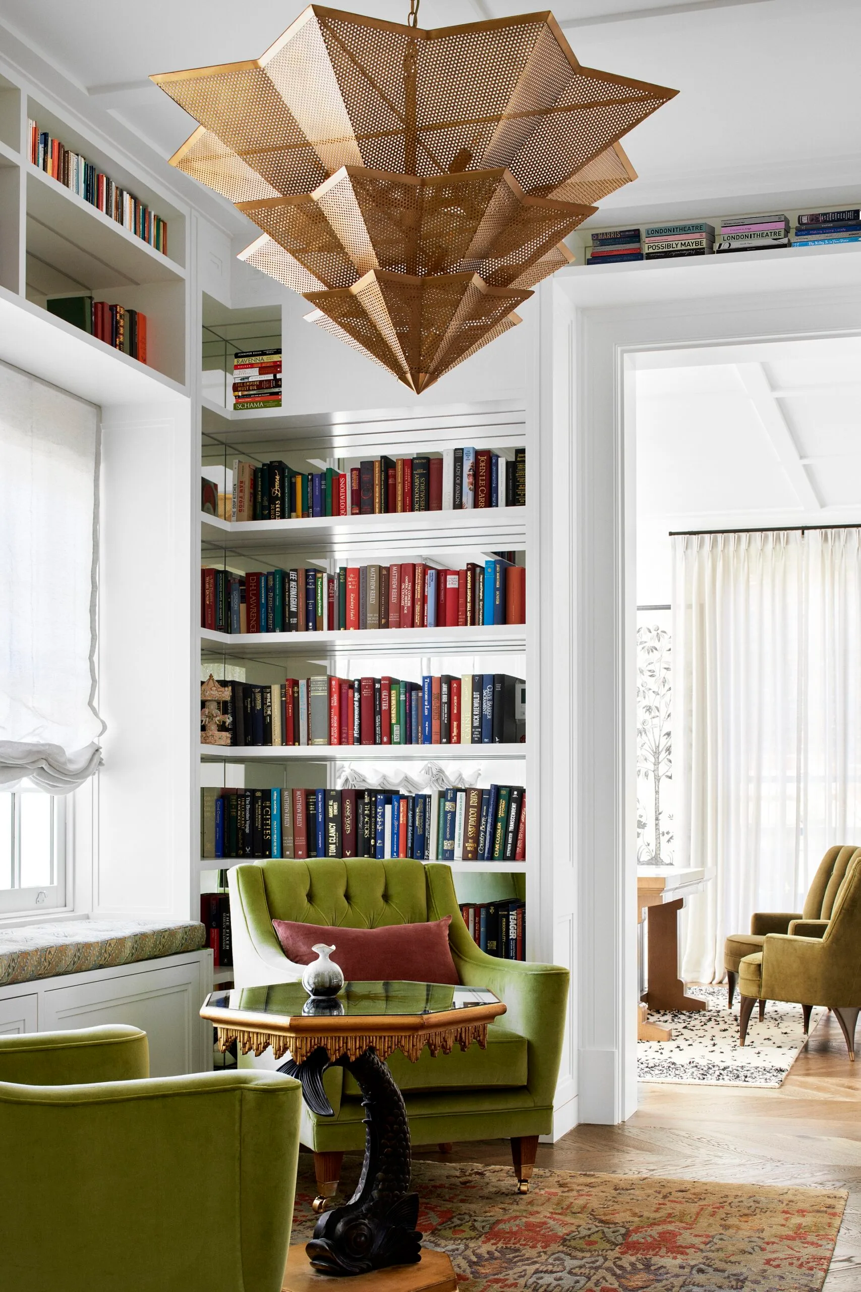 In the English country house-inspired library, with its 60 metres of floor-to-ceiling bookshelves, a Currey & Company ‘Hanway’ chandelier in gold-leaf perforated iron steps down from the ceiling. “In such a traditional home, you expect to see a crystal chandelier, but this is so unexpected,” he says. Another surprise element: a whimsical fish table with Oriental overtones. Similarly, in the main bedroom, a Wildwood Regatta yacht pendant presents a fabulous flight of fancy.