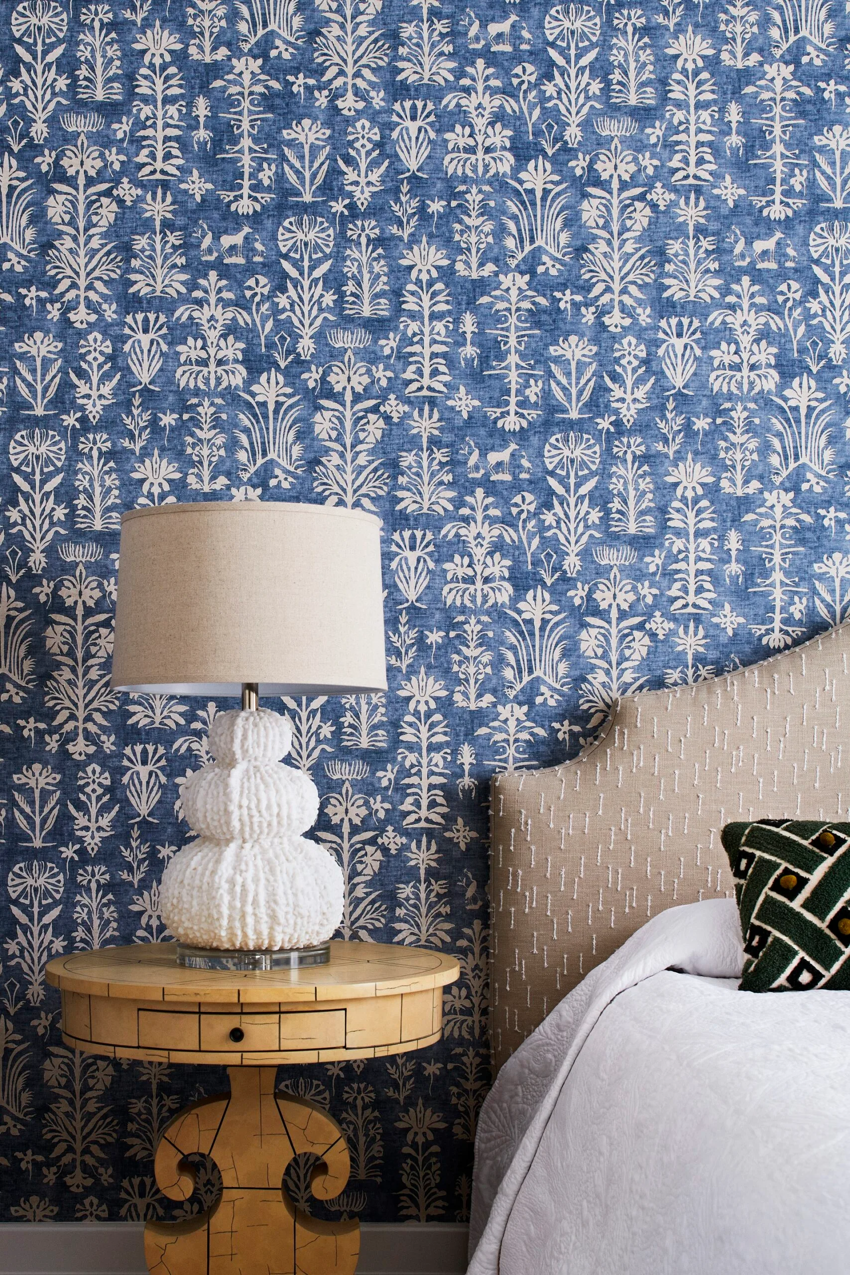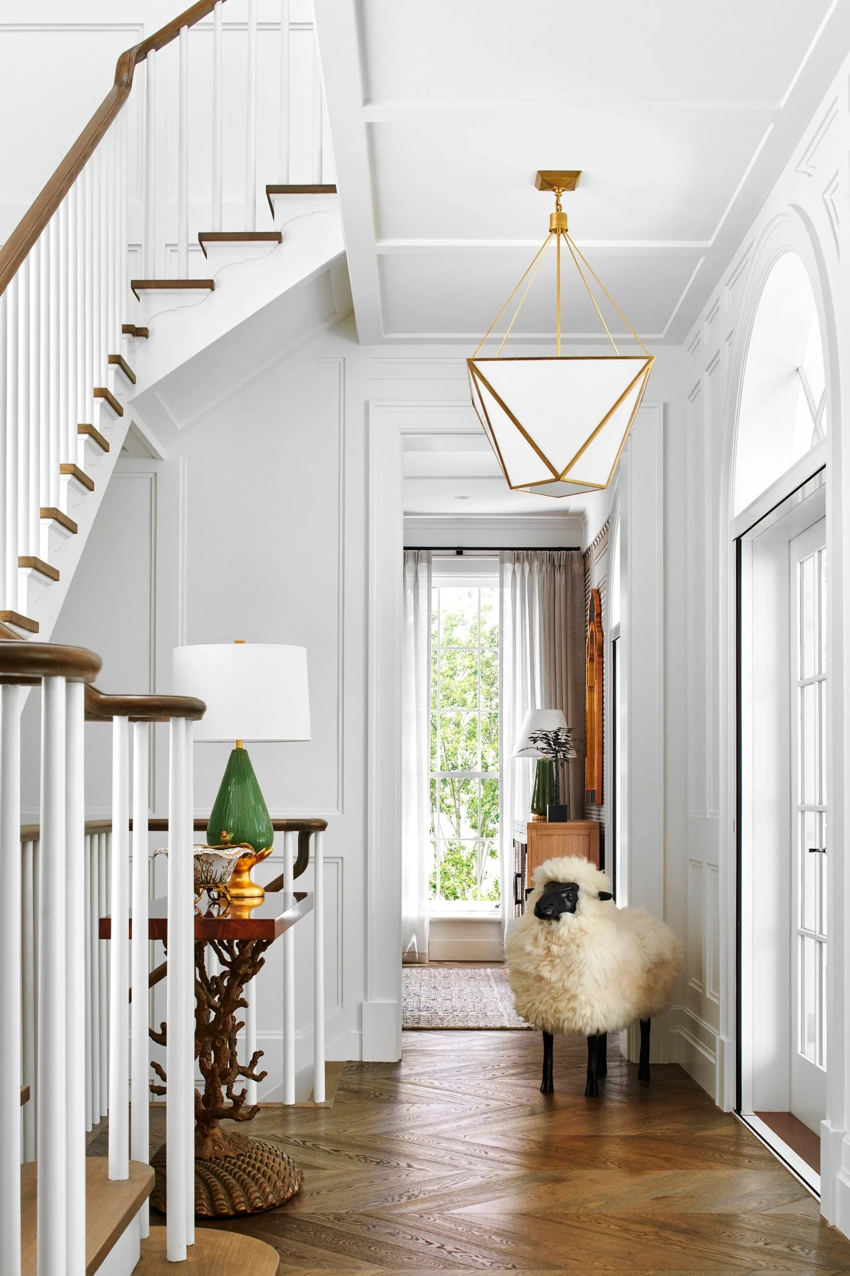 In the hallway, an errant sheep facing a brass seashell-and-tree-branch console hints at what’s to come. “It is a large house, so I wanted to introduce the playful and unexpected,” says Aaron. The sitting room is designed around a Currey & Company ‘Berkeley’ gold-leaf chandelier, “with a Moroccan and a circus vibe – the room is a glorious mishmash of exotic ideals”, he explains. And a palm tree knick-knack caps it off.