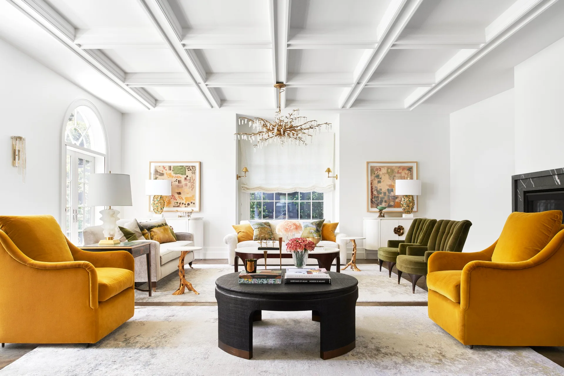 In the open plan, two mustard armchairs sit below a Currey & Company ‘Forest Dawn’ chandelier, its crystals like raindrops dangling off golden tree branches. “The bold, warm colours help break up the room, creating defined sitting zones. When you’re standing at the kitchen, this room reveals itself in so many layers,” says Aaron.