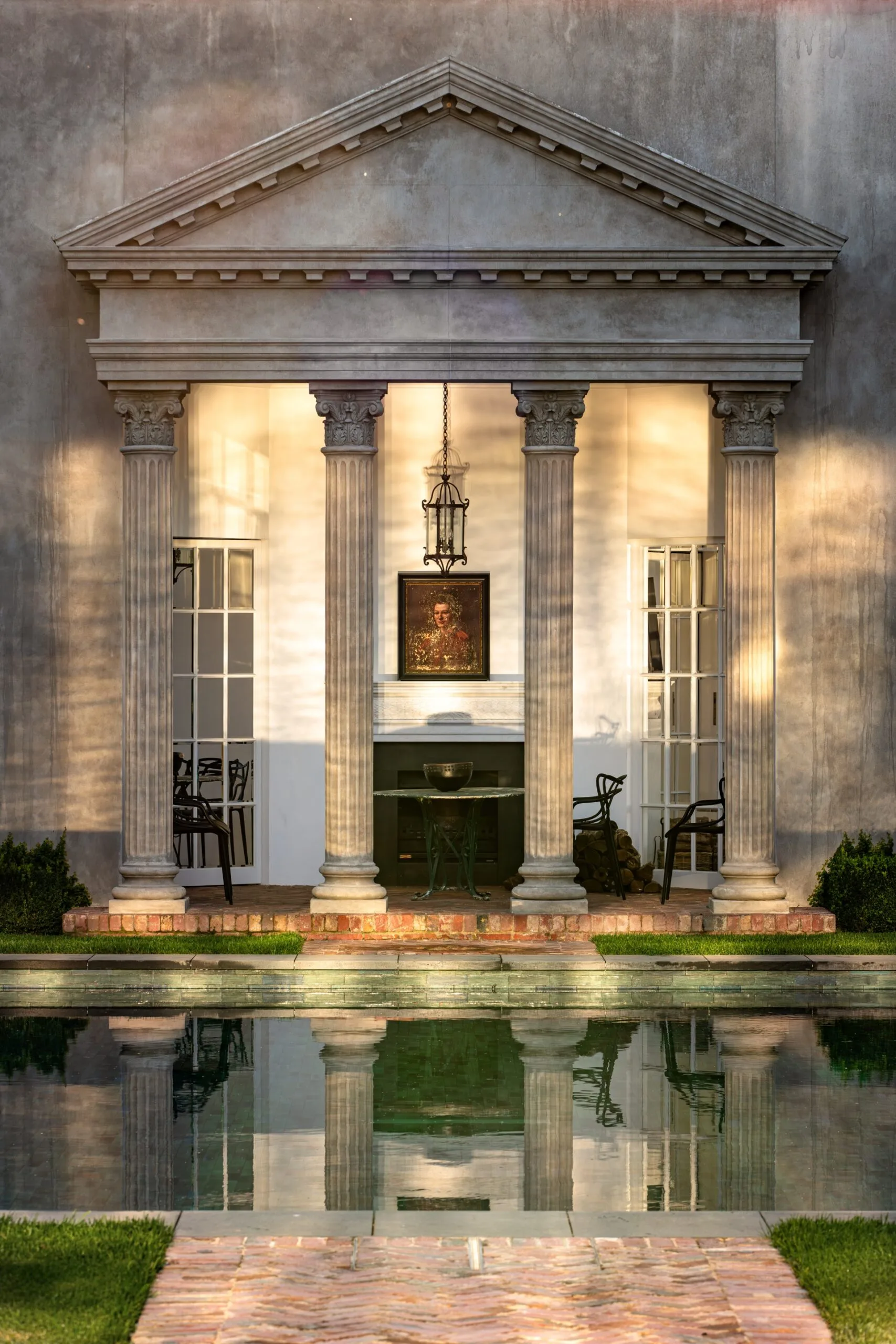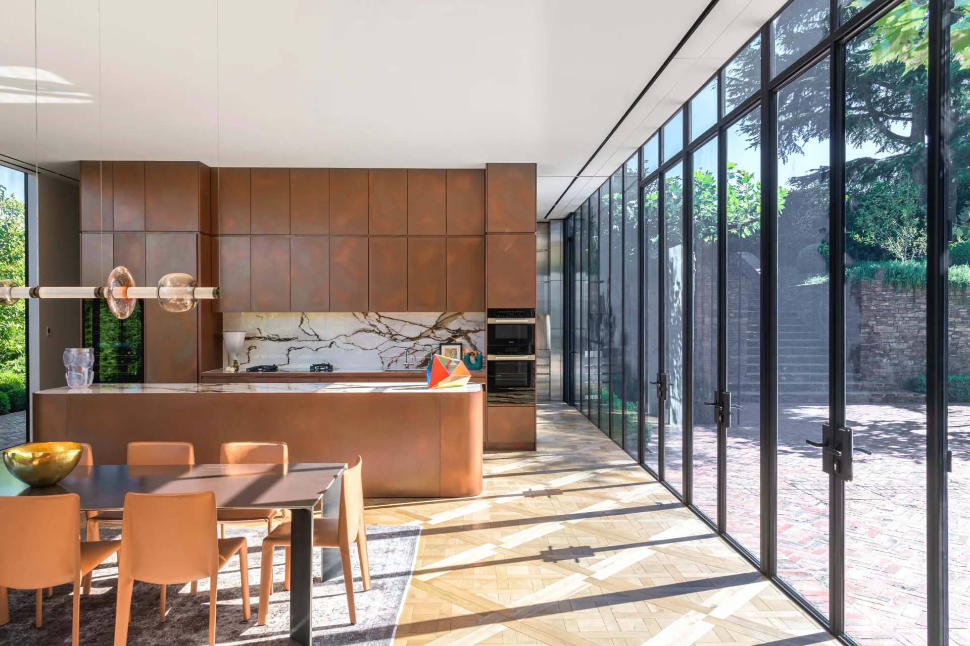 Probably the most transformative addition to this project was the construction of this grand pavilion beside and to the rear of the main house, with glass walls and gold-coffered ceilings to deliver crisp acoustics for the concerts, plays, exhibitions and dance performances that take centre stage between cocktail and dinner parties. Richard has made this a musical home, he says. “We have two grand pianos named Clive and Betty, after my parents. Clive lives in the pavilion while Betty resides in the drawing room and I play them both every day.”