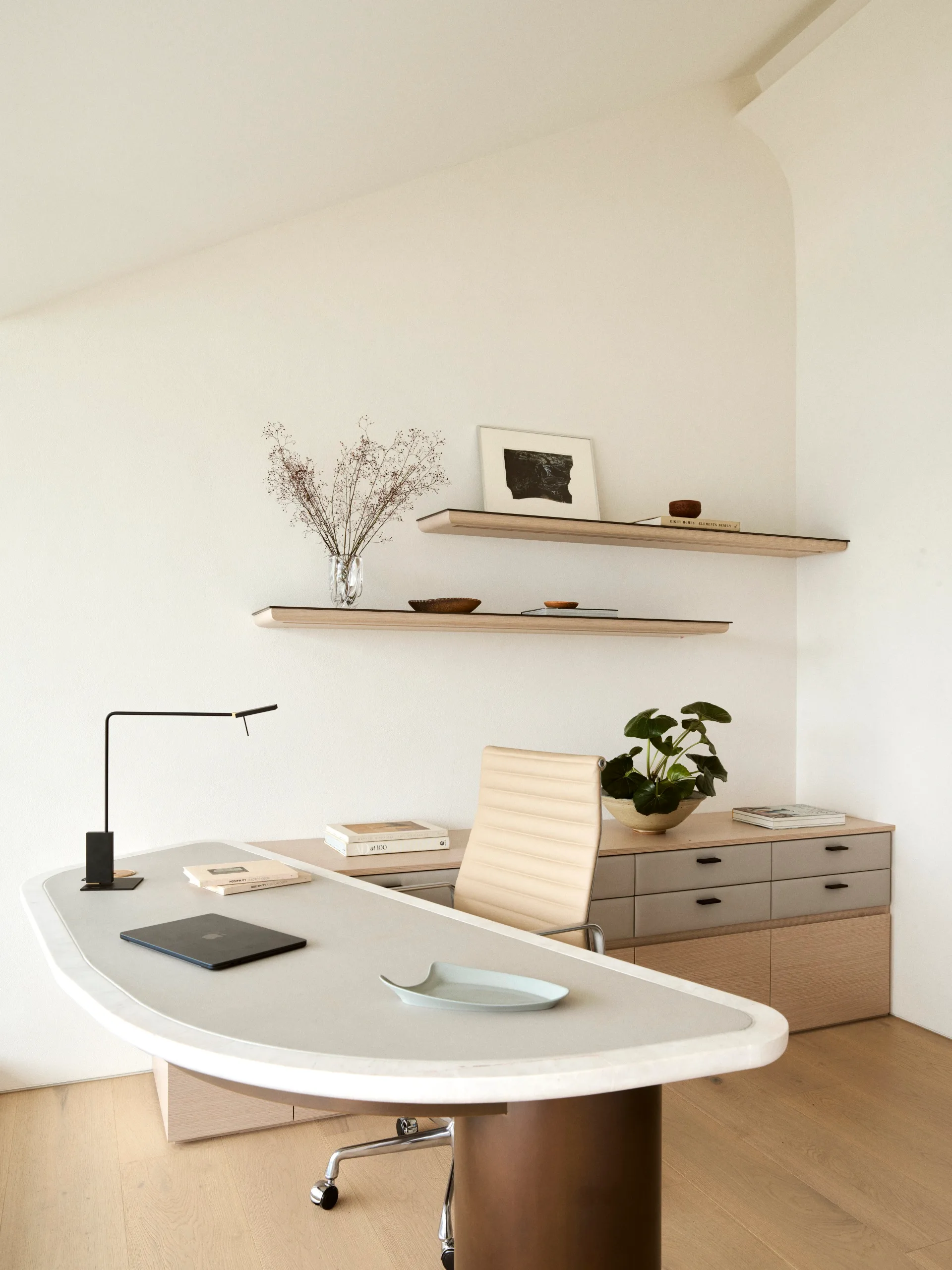 How would you describe the completed interior? With sailing and luxury yachting among the clients’ most cherished pastimes, we drew maritime imagery and traditional boat- building techniques into the interior through a series of sculpted, tailored and finely crafted details. Steamed timber forms echo the elegant curves of a boat’s hull, sweeping ceiling planes and skylights evoke the billowing sails of a mast, and shiplap panelling recalls a vessel’s watertight cladding. This narrative carried through to the material palette, combining light linen textiles, pale oak floors and cabinetry, sea-foam green quartzite stone benchtops and silk carpets. Ultimately, we wanted the clients to feel like they were taking off on a voyage and getting lost in views of the ocean and clouds.