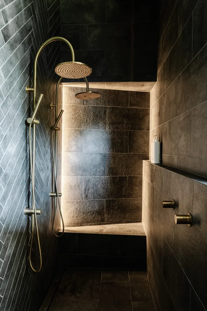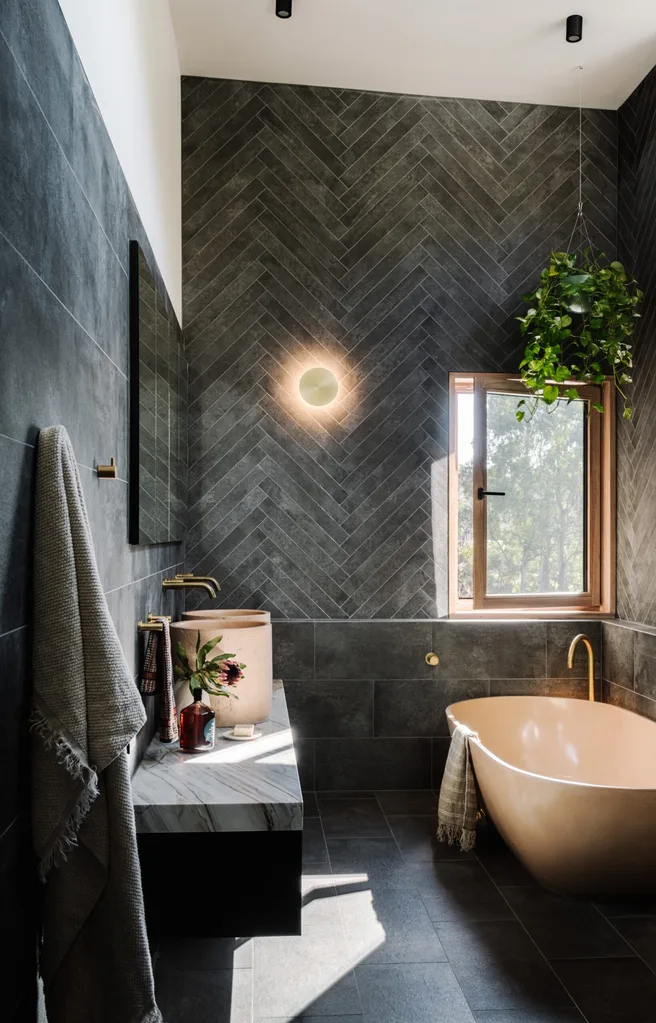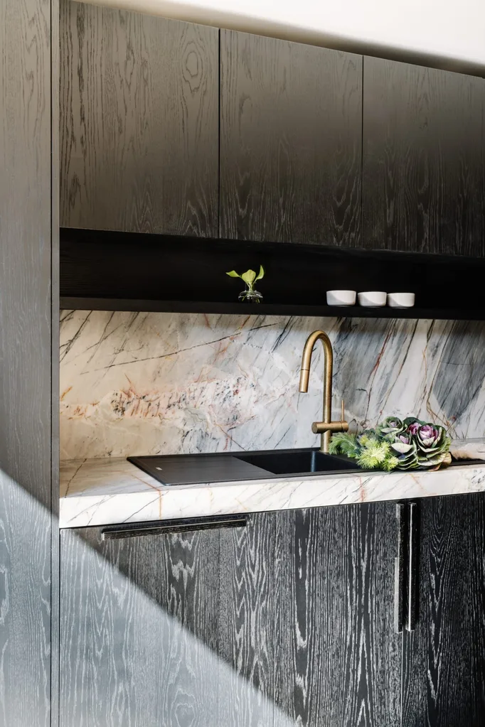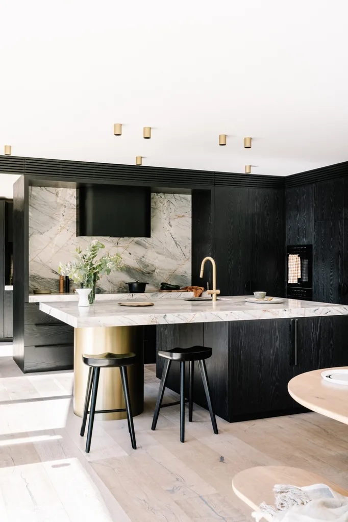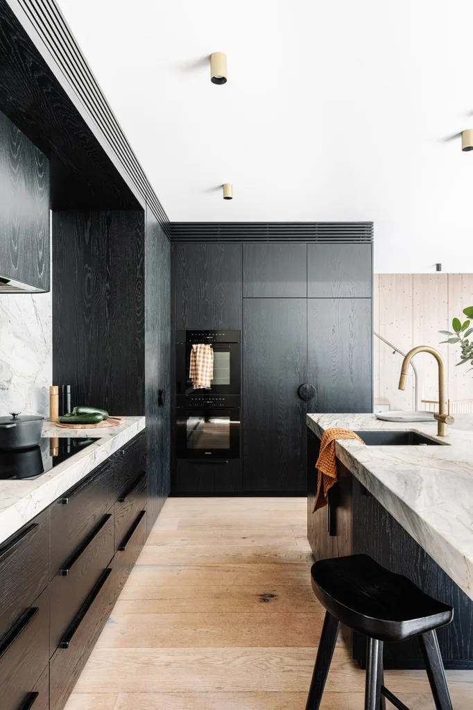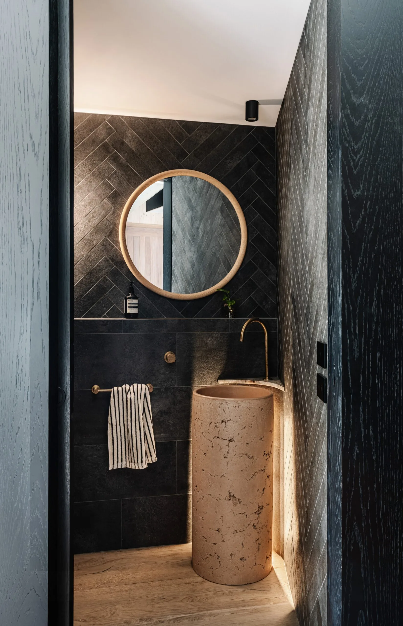 She had to negotiate for dark kitchen joinery, hallway walls and bathroom tiles. “Our last house was white and beige, so I wanted to do something quite opposite and daring, and use a lot of black,” Monica explains. “Jesse wasn’t keen, but I said, ‘Trust me, it will work’.” Natural materials such as stone, tumbled brass and hand-poured concrete add even more depth and patina to the interiors.