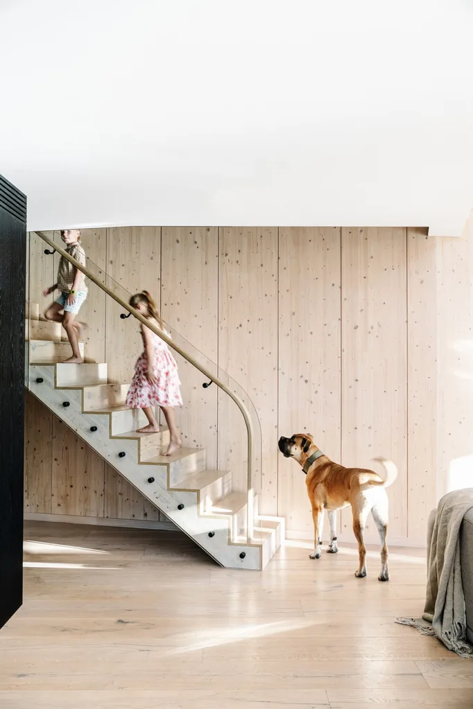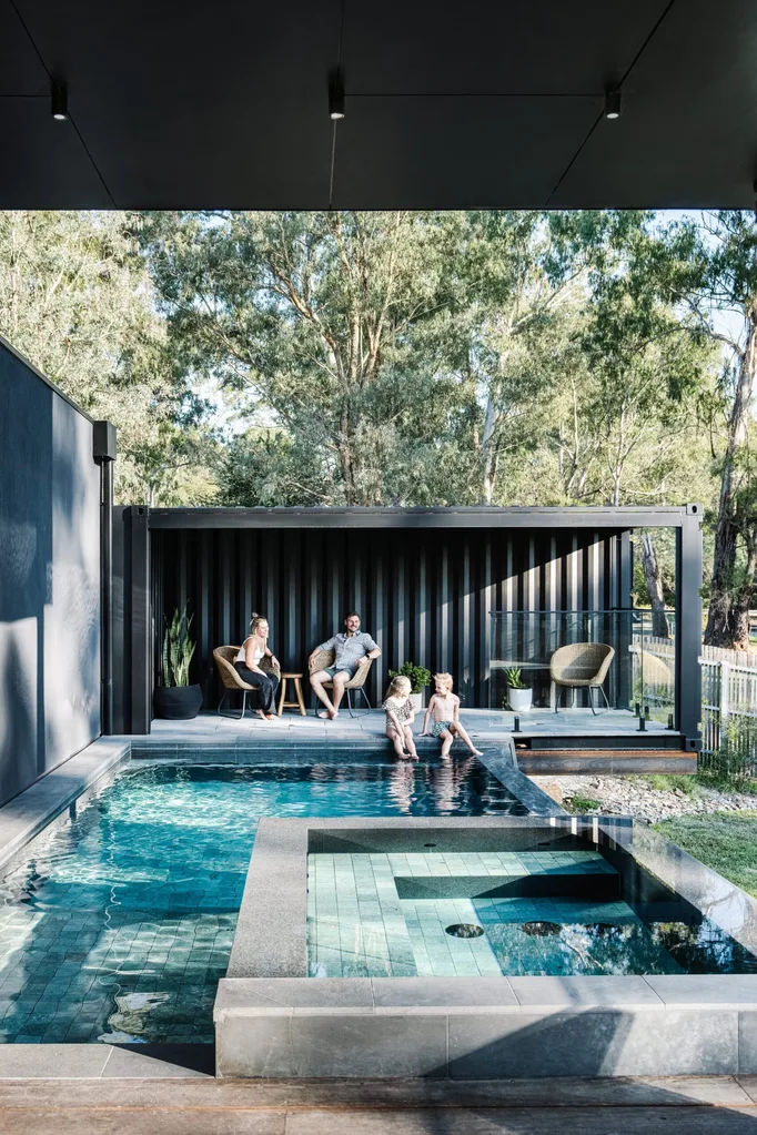 Monica likes to retreat to the shipping-container poolside cabana “for a Zen moment” while Jesse’s wrangling the kids inside. She’s often joined by the family’s 60-kilogram South African mastiff, Memphis. “He’s our big laze about dog,” Monica says, laughing. “He sleeps for about 23 hours a day!”