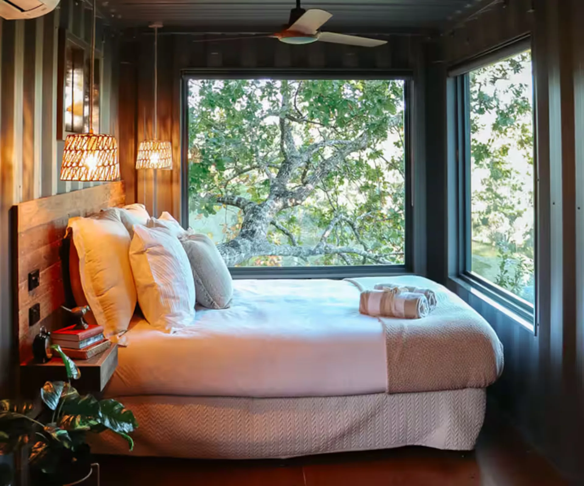 Nestled atop the Bellthorpe range in the Sunshine Coast Hinterland is a compact, timber-lined one-bedroom cabin perched on a 50-acre working farm. Enjoy sweeping garden and bush views from the comfort of your bed – which is carefully built into an oak tree – or perhaps the jacuzzi, if you’re up for soaking under the stars. Thoughtful welcome touches, such as the welcome breakfast hampers with homemade jam, butter, yoghurt, and even sparkling wine, add a touch of luxury to this romantic retreat. Plus, its beautiful natural backdrop provides the perfect base for visiting nearby attractions like such as, Woodford, Sunshine Coast beaches, Australia Zoo, botanic gardens, and lush rainforest trails.