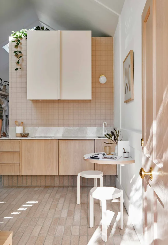 Peachy keen cabinetry pairs beautifully with timber, small square tiles, curves and polished concrete in this renovated “lifted and shifted” Queenslander designed by ex-Block star, Carlene Duffy (aka Cedar and Suede).